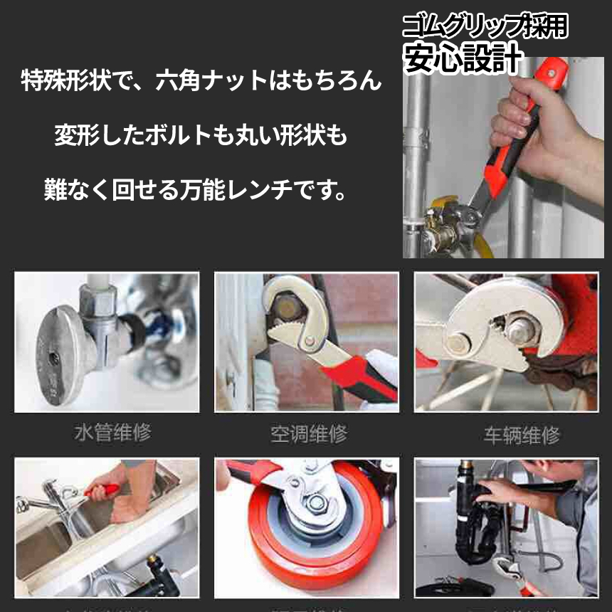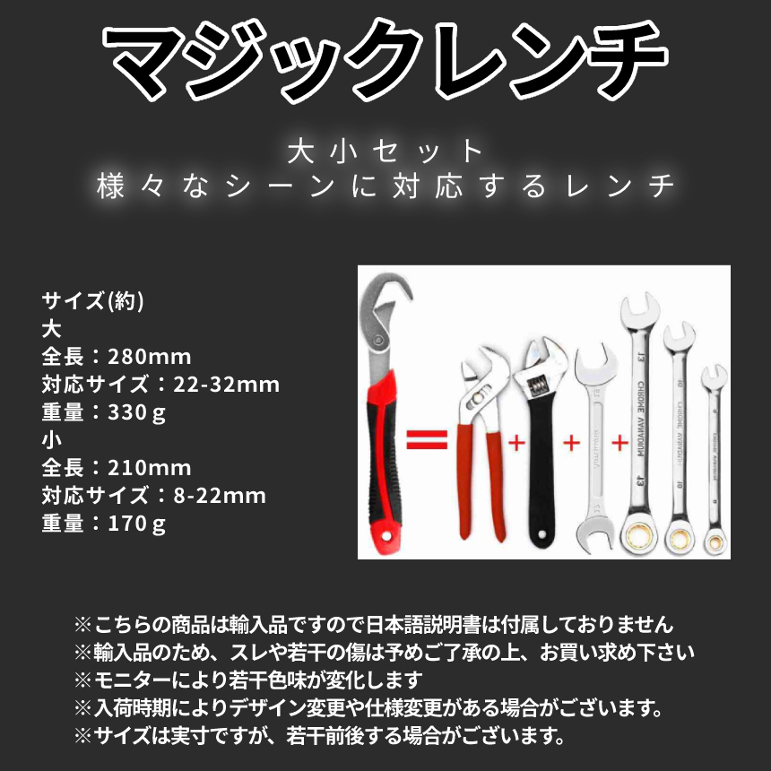 | 送料無料!!! 送料及び下記のご案内をご確認の上、ご入札お願い致します。 離島地域を除く九州、四国、本州まで送料無料。 ※北海道は+1000円、離島地域及び沖縄県は+3000円にて承ります。(発送前に加算) ※画像内にカラー及びサイズ等の選択が可能と記載がある場合がございますが、 お届けする物はタイトルまたは商品説明文に記載の物です。 ★※注文後のカラー変更や異なるカラー・サイズ指定等は一切承っておりません。 ※★※仕様(ロゴデザイン/ロゴ有無等も含む)は予告なく変更する場合があります。 ※多少の汚れや小傷がある場合がございますがご了承ください。 梱包は簡易包装ですので、箱の角落ち等はご了承願います。 【商品説明】 レンチがたくさんあって工具箱がグチャグチャな人、 作業台の上が整理できていない人のための便利レンチです。 大小セットなので様々なサイズに対応! ナットを開け閉めする際の工程がらくちんなマジックレンチです。 ゴム製グリップを使用していますので、手にフィット! マジックレンチは回す角度が狭いのでスペースが少ない空間でも活躍♪ DIYや職人さんはもちろん、車載工具としても、 自転車・バイクのツーリング時にも最適! 様々な工具が不要のマジックレンチ大小セット!! ======================================== 【商品仕様】 寸法(約) : 画像参照 対応サイズ: 画像参照 パッケージ:2本セット 大×1小×1 ※多様なサイズにマッチするように予め接合部にユトリを持たせてあります。 ※入荷時に発生するスレ傷や汚れは予めご了承の上、ご購入下さい。 ※入荷時期により多少のデザイン変更が生じる場合がございます ※日本語取り扱い説明書は付属しておりません ※ナットやボルトの形状により対応不可の場合もございます ======================================== ![]() ![]() ![]() ![]() ![]() |