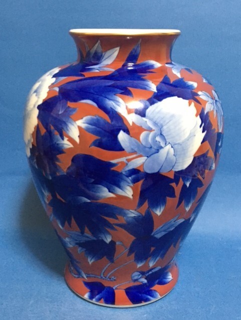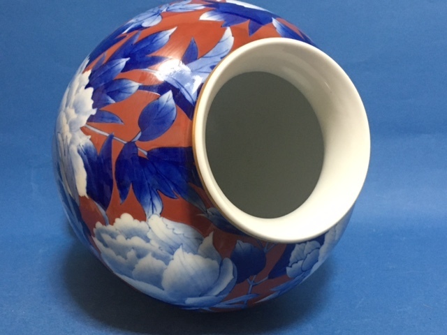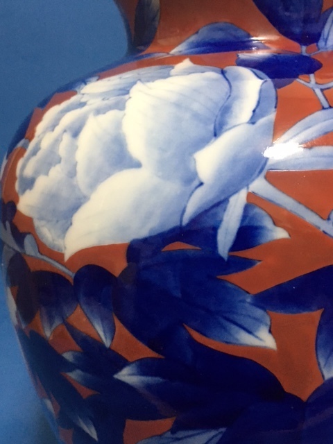 ◎深川製磁 染錦牡丹外赤 31.5cm大花瓶◎