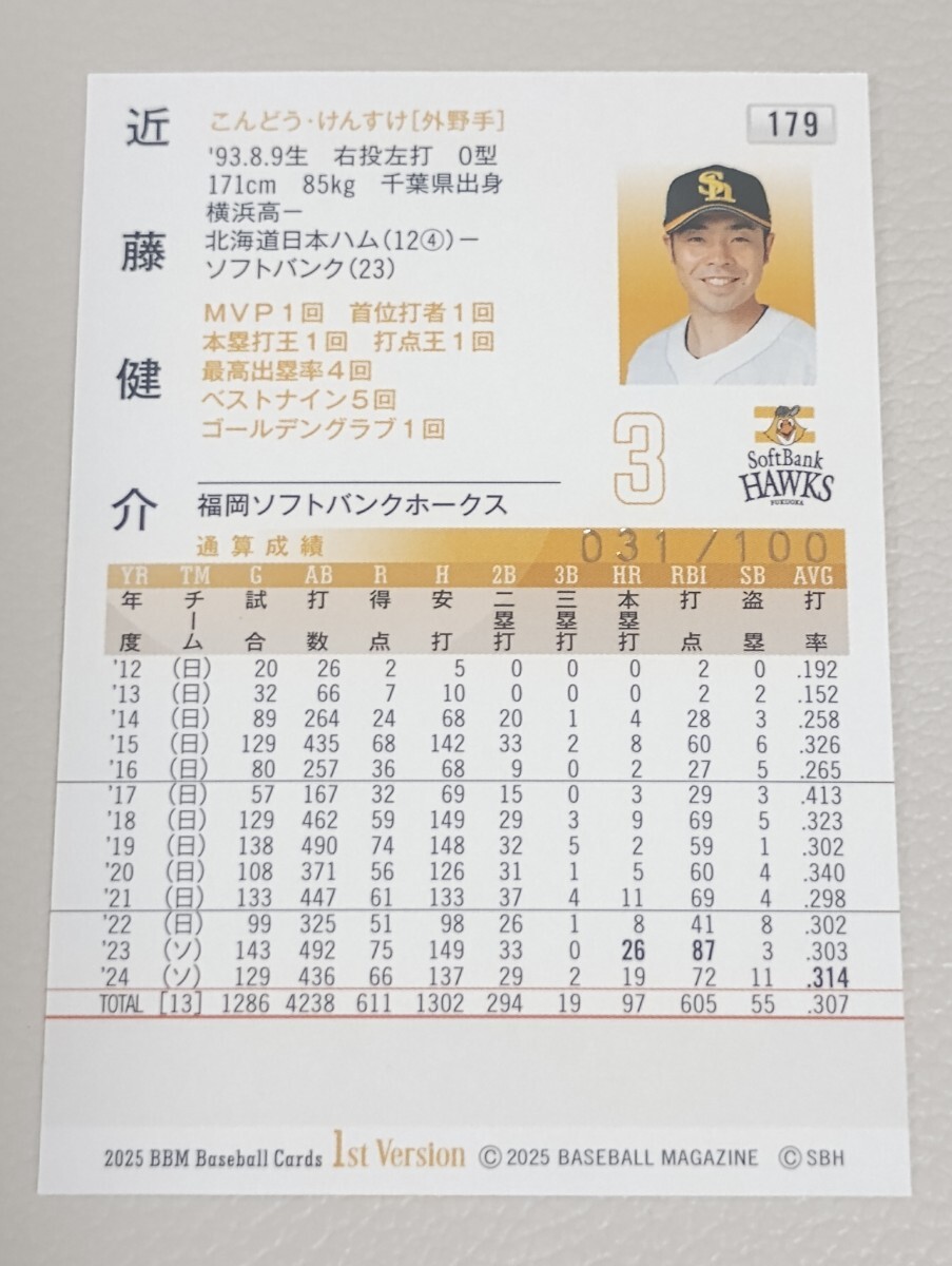 【100枚限定】BBM 2025 ベースボールカード 1ST VERSION バージョン 近藤 健介 箔サイン ソフトバンク ホークス