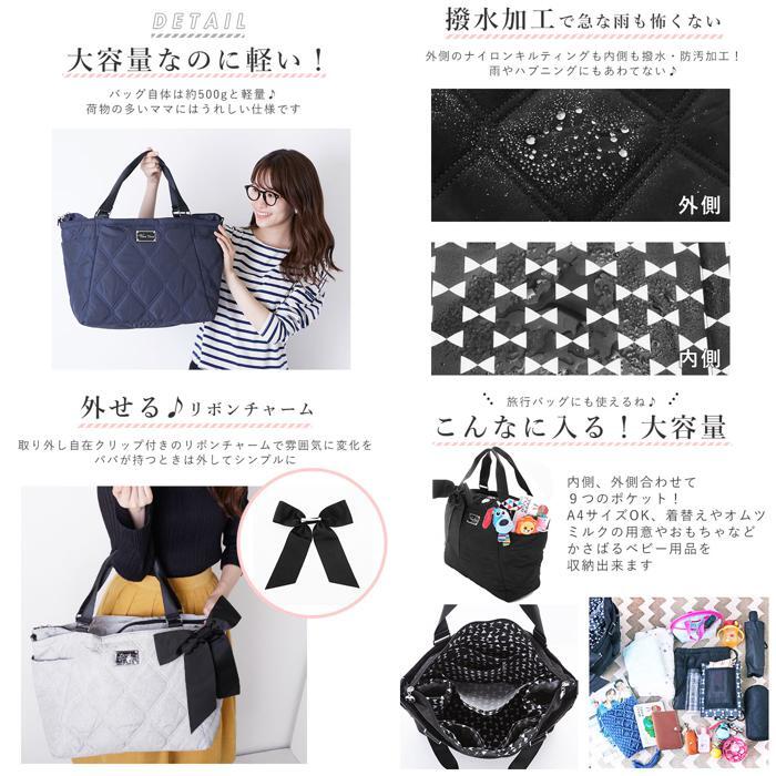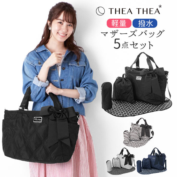 | 商品説明 | ・品のあるカラーで、収納力抜群のマザーズバッグです。トートバッグとして、またベルトをつけてショルダーバッグとしても使える2wayタイプ。 ・軽量ナイロンキルティング素材で、トートバッグのみの重量は約536g!大容量なのに、肩にかけた時にとっても軽い♪ ・おむつ替えシート、ボトルケース、おむつ入れ巾着が付属します。 ・しっかり開くメインポケットは使いやすく、裏地にかわいいリボン柄の生地を使用。 ・外側の両サイドに、たっぷりサイズのオープンポケット×2。内側にもマグネットボタン付きのポケット×1、オープンポケット×2、ペットボトル(哺乳瓶)ホルダー付き。 ・トートバッグの正面には「Thea Thea」のスタイリッシュなロゴプレート付き。持ち手にはエレガントな飾りリボンが付いています(取り外し可能)。 |