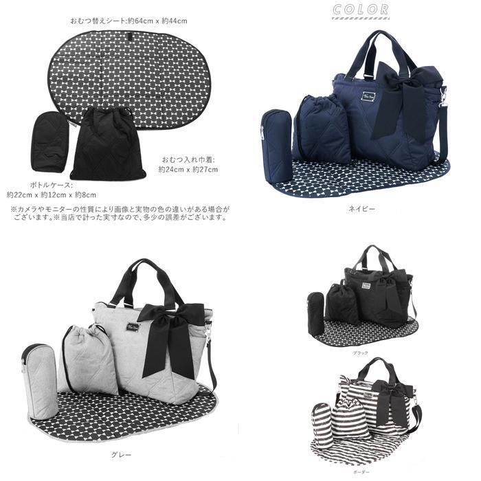| 重量 | [トートバッグ]約536g(※ショルダーベルトを除く重量です) [ショルダーベルト]約85g [おむつ替えシート]約92g [おむつ入れ巾着]約88g [ボトルケース]約62g [総重量]約863g |