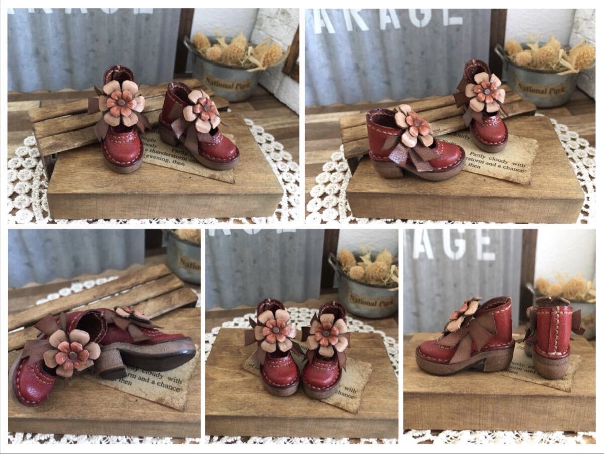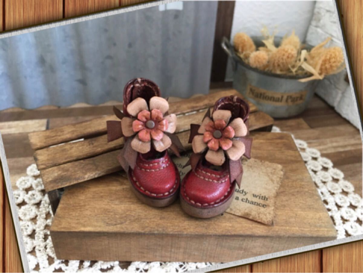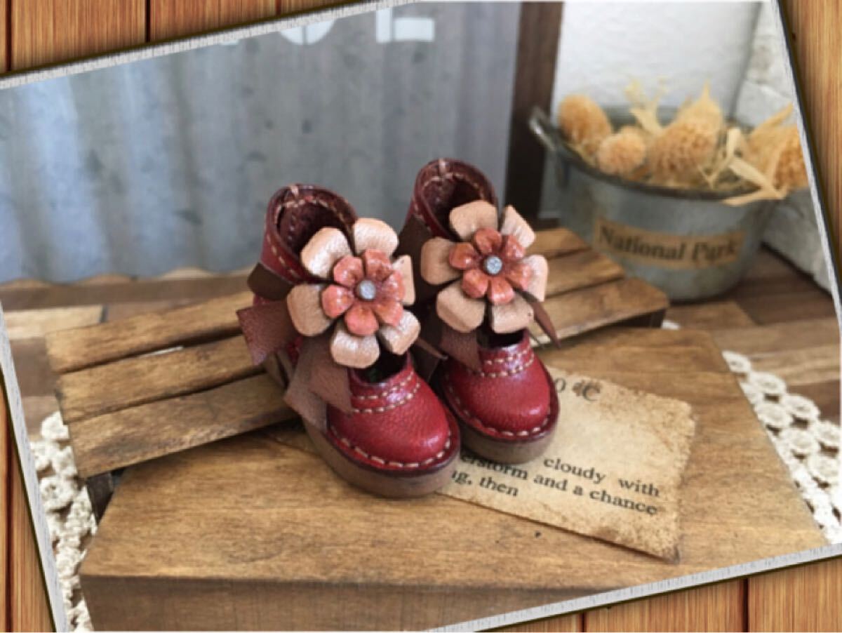 【素材/色】牛ヌメ革/落ち着いた赤 お花は赤茶、淡ブラウン リボンは赤茶、ブラウン 靴底はダークブラウン
