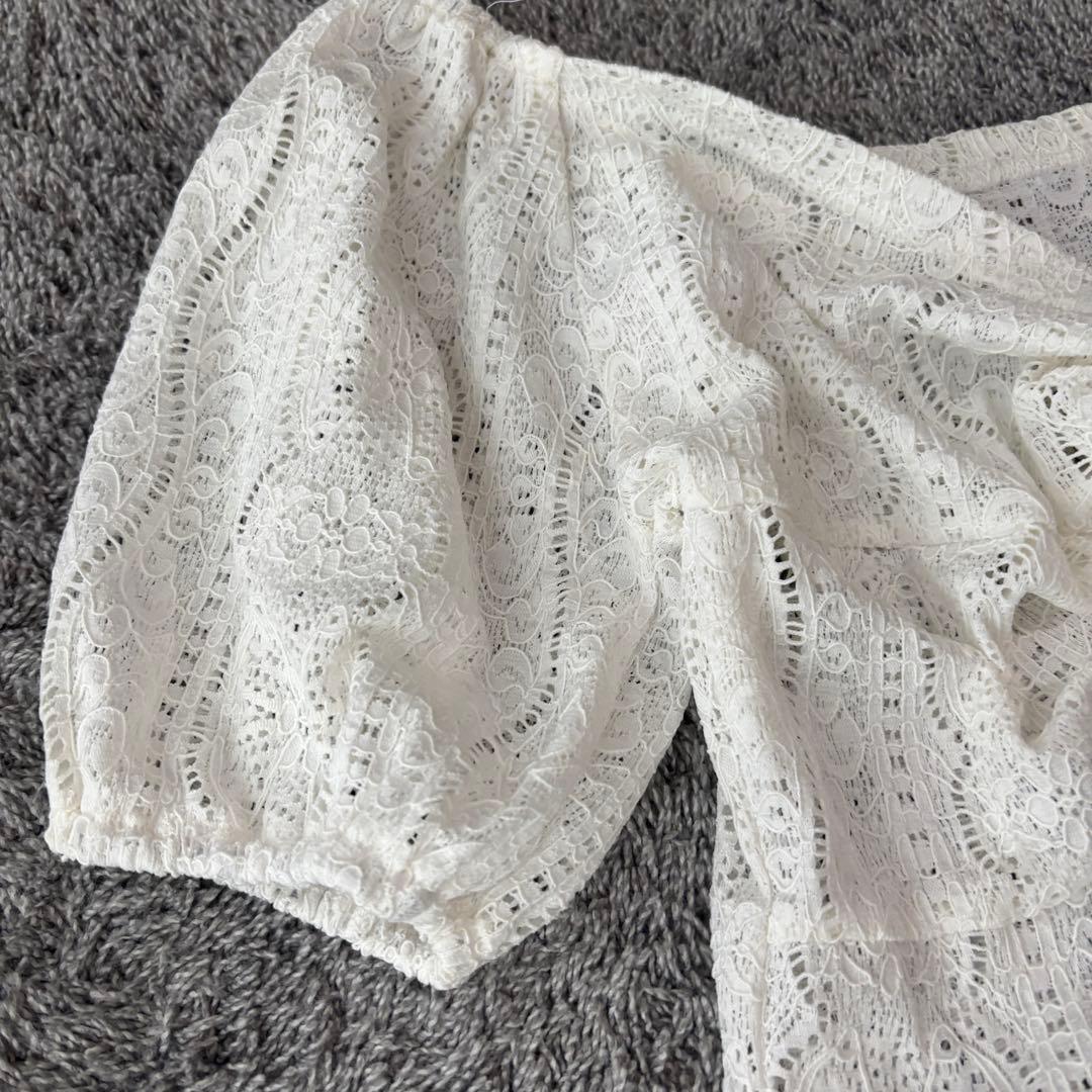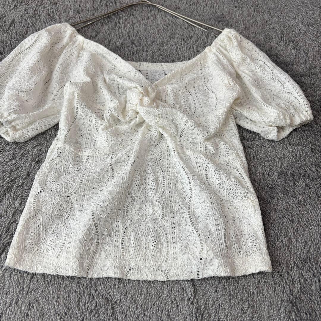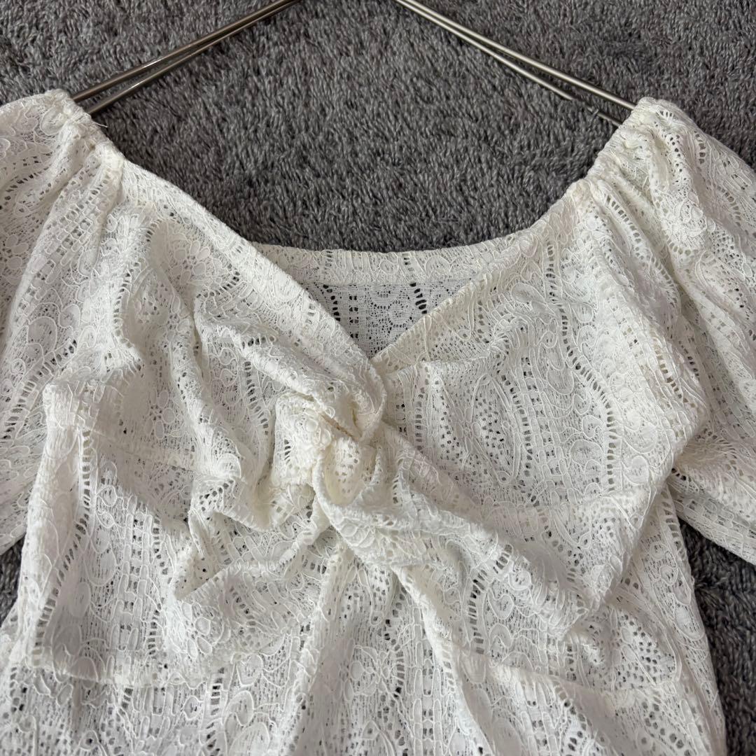 レース素材のホワイトオフショルダーシャツ、リボン付きデザインが特徴。