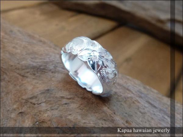 リング一周にプルメリアと波がモチーフになった彫刻が綺麗にデザインされています。