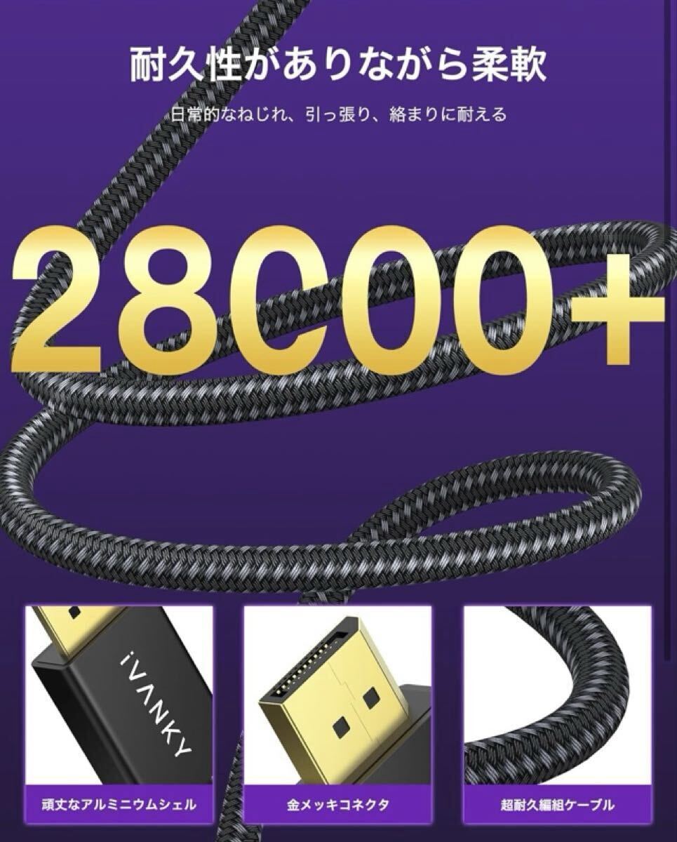 【超耐久 軍用グレードのdpケーブル】ノイズ遮断率98%の3層シールド構造を採用したdpケーブル。15,000回屈曲テスト済みで、金メッキ端子が安定接続を保証。