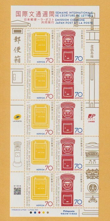 ○【記念切手】国際文通週間 日本郵便ーラ・ポスト共同発行《70円》 切手シート 2021年  未使用