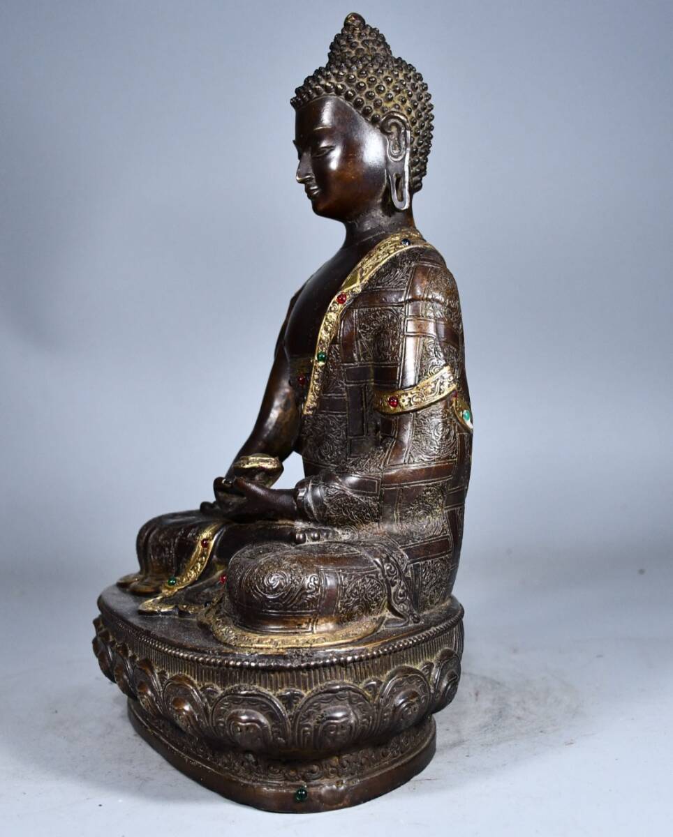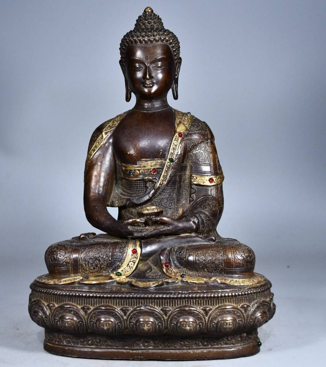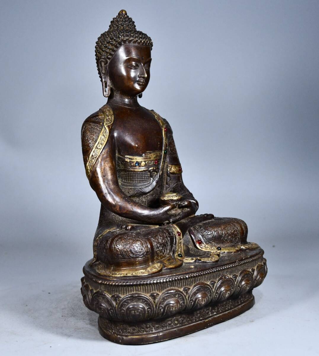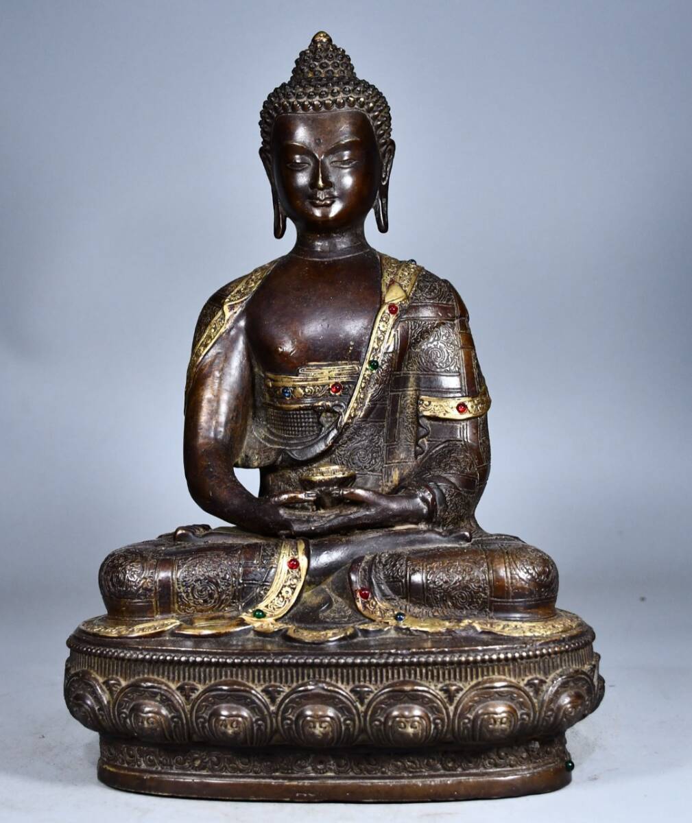 *珍品旧蔵* 清 黄銅 モザイク寶石 釋迦牟尼 胎體厚重 仏像 極細工 中国古玩 仏教古美術 供養品 H45