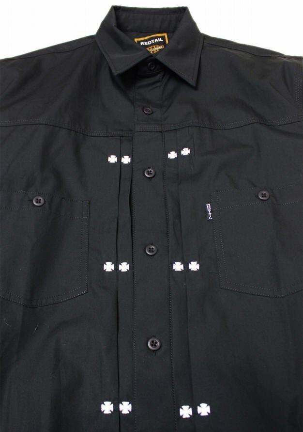 フロントボタンの両サイドには”アイアンクロス”柄の刺繍がダブルで施されており、ポイントでシャツのデザイン性を高めています!