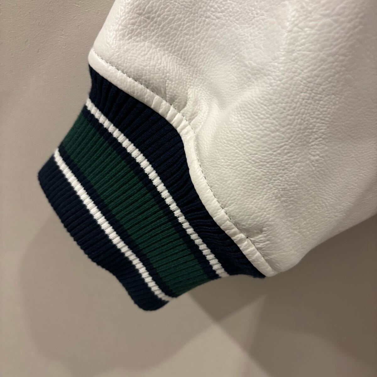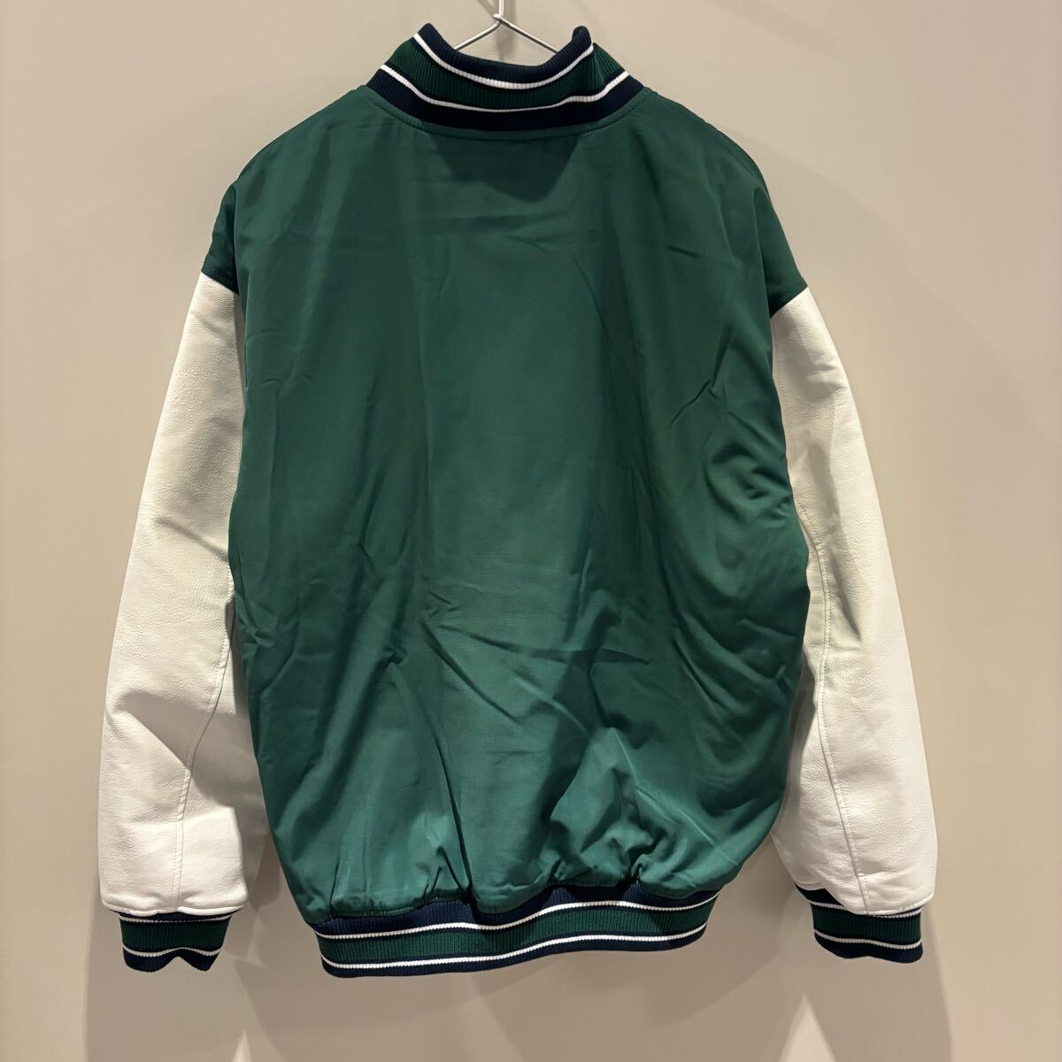 深みのあるグリーンにホワイトスリーブ、リブのラインもアクセントになっており、ストリート・スポーツMIX・韓国ファッション好きにぴったり。