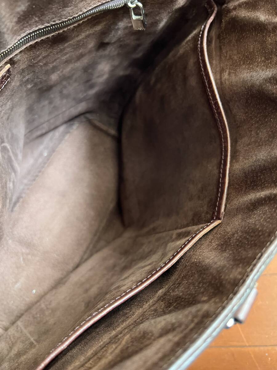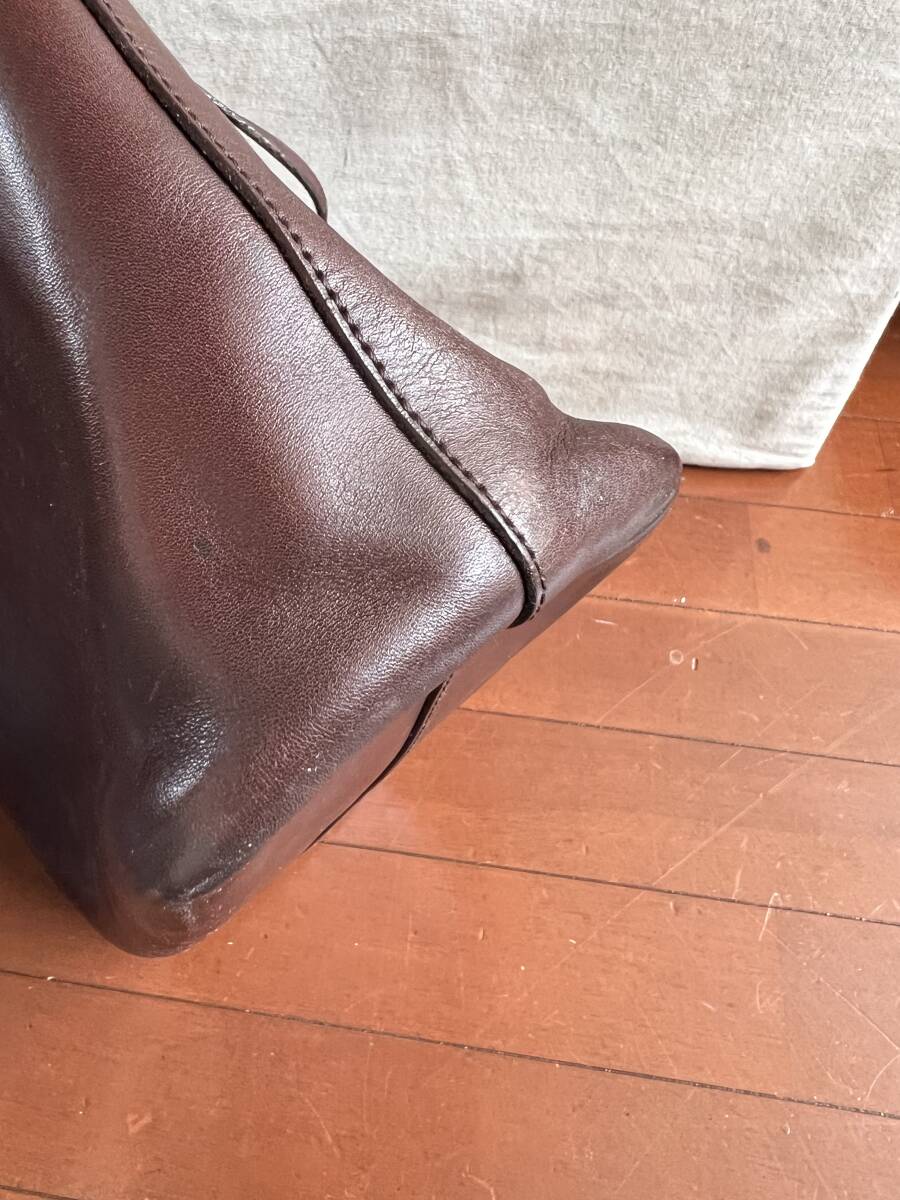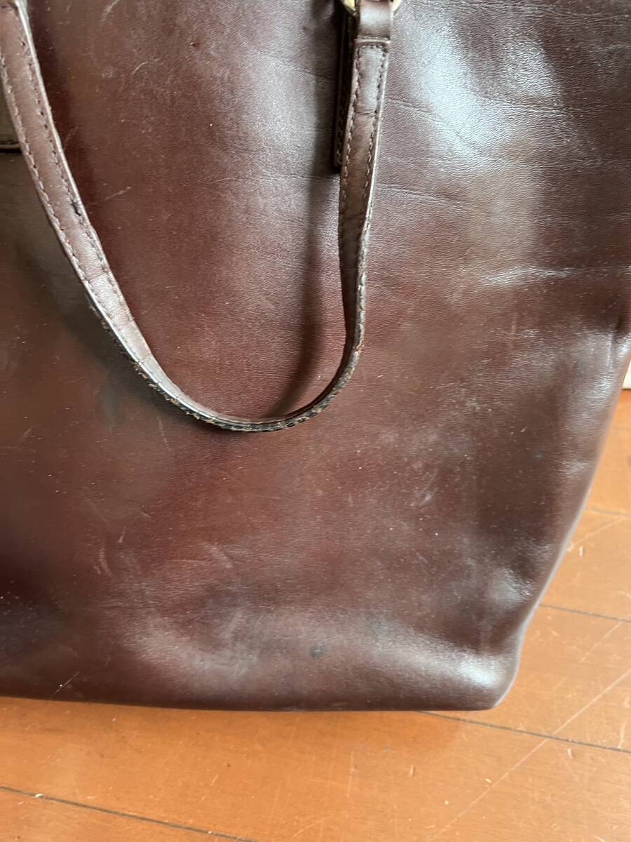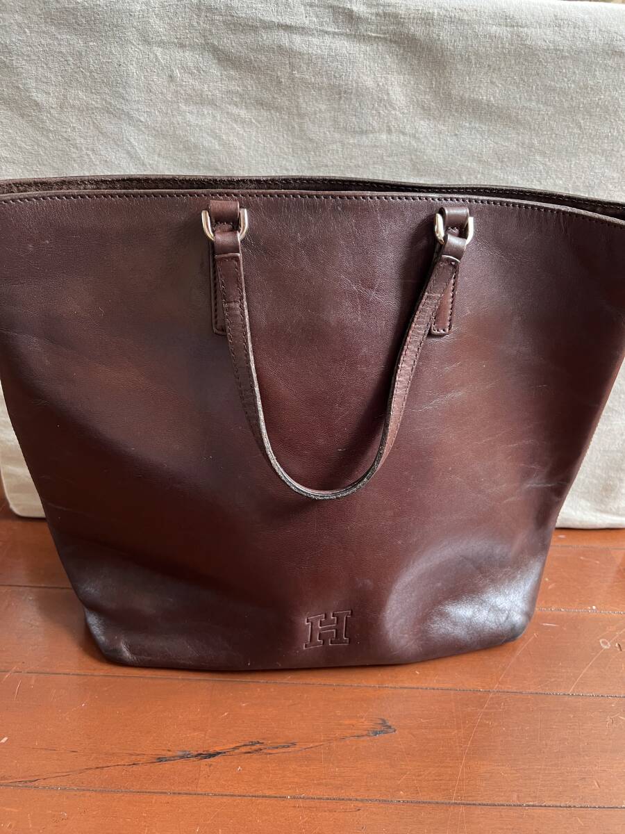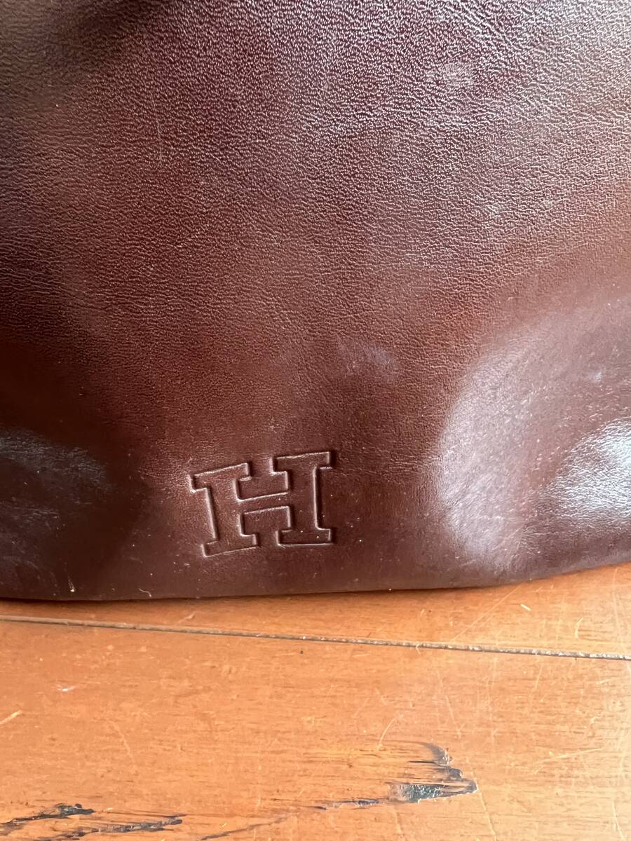 HIROFUヒロフの革製のトートバッグです。サイズは、縦31cm、横30cm、マチ12.5cm位です。お色はダークブラウン系です。傷はあります。使用品ですので神経質な方は御遠慮下さいね。ノークレームノーリターンでお願い致します。その他いろいろ出品していますので見て下さいね。