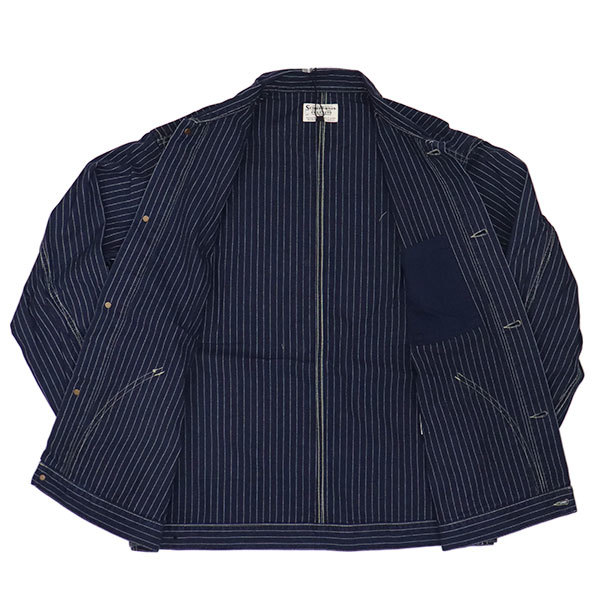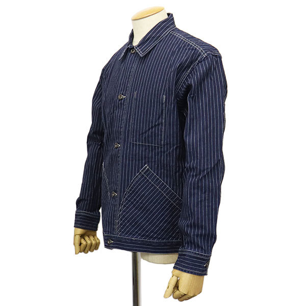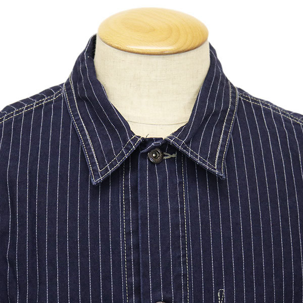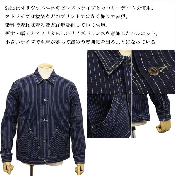 スペック | Schottオリジナル生地のピンストライプヒッコリーデニムを使用。ストライプは抜染などのプリントではなく織りで表現。染料で着れば着るほど経年変化していく生地。短丈・幅広とアメリカらしいサイズバランスを意識したシルエット。小さいサイズでも肩が落ちて緩めの雰囲気を出るようになっている。WASH INDIGOはインディゴ染料 弱加工を入れてあたりを出してます。 |
