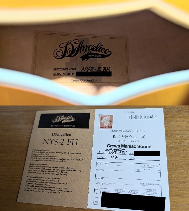 2020年に新品で購入。有名ギタリストYouTuberが使用していることで知られるD'angelico NYS-2ですが、こちらはその方が使用するフローティング・ミニハムバッカー仕様ではなく、極少数生産のフルハムバッカー(ボディマウント)モデルとなります。市場流通はほとんどなく、このコンディションで出品されることは非常に稀です。