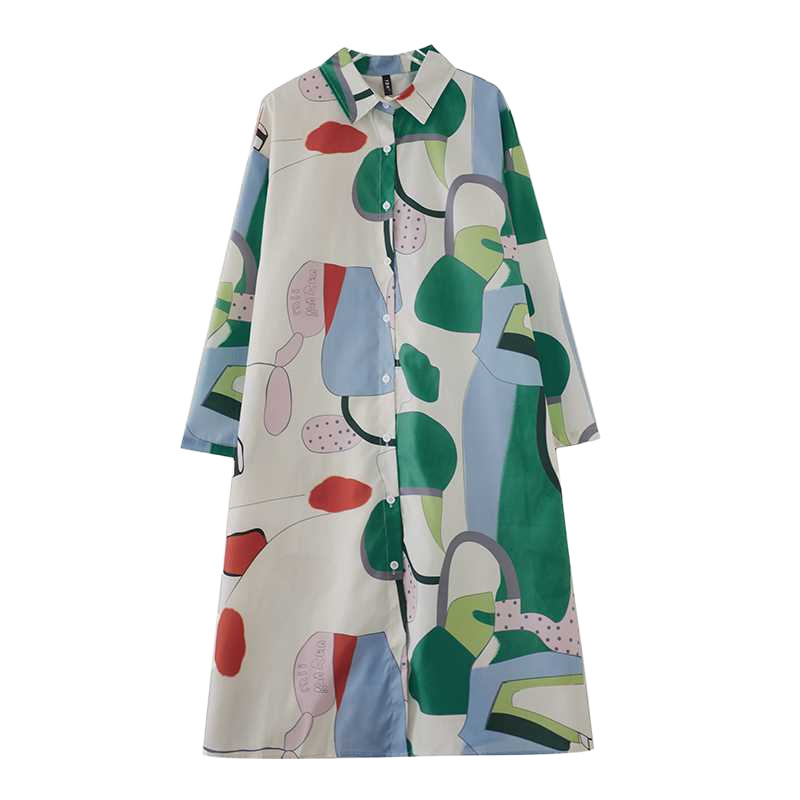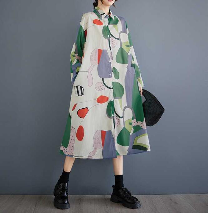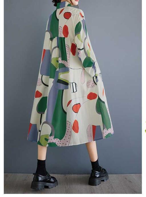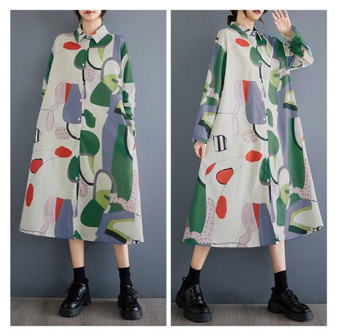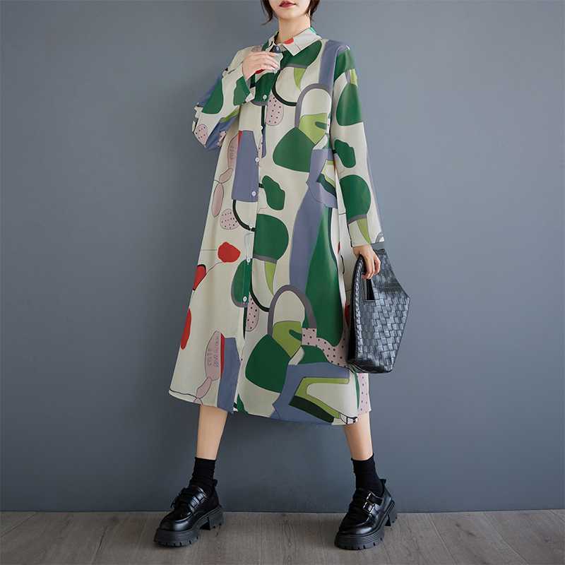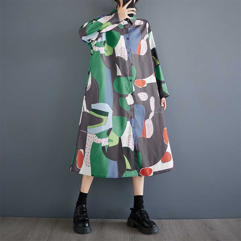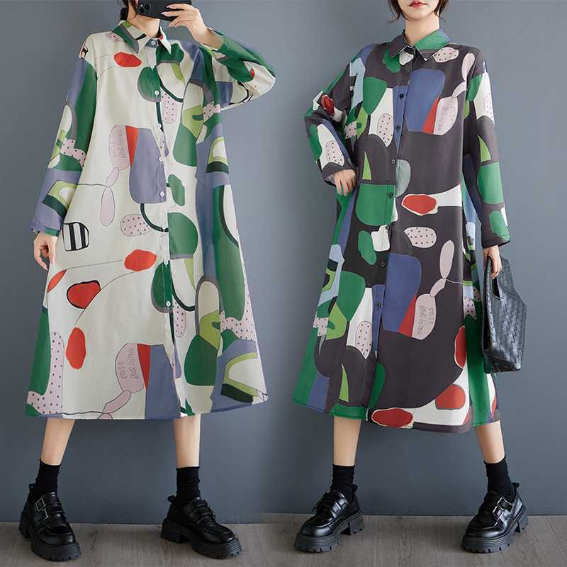 新入荷新品レトロ総柄がとってもおしゃれなシャツワンピ新品大きいサイズロング丈コットン風ワンピお色選択可