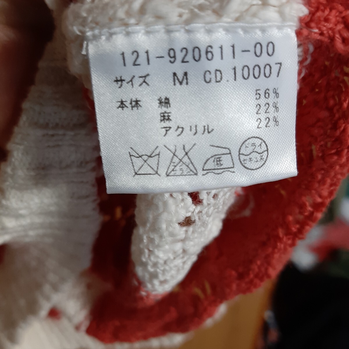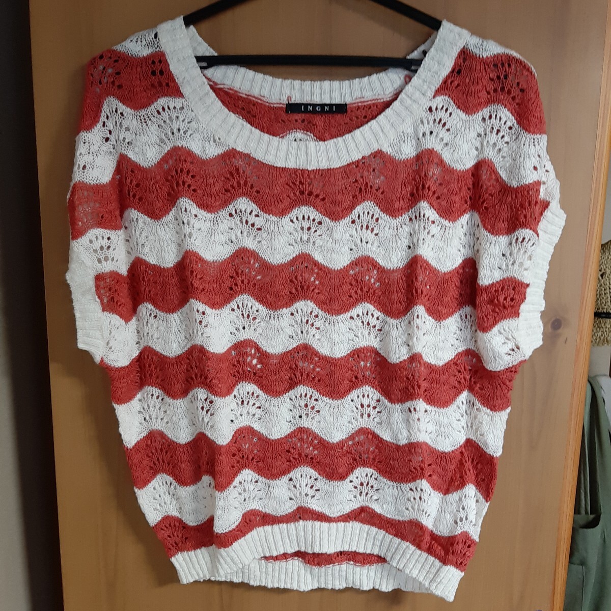 赤とオフ白のボーダーデザインの透かし編みニットセーター、軽やかな素材感で夏に最適。