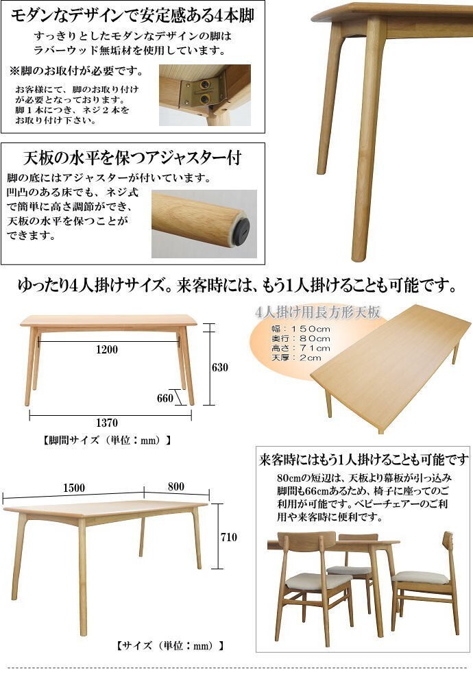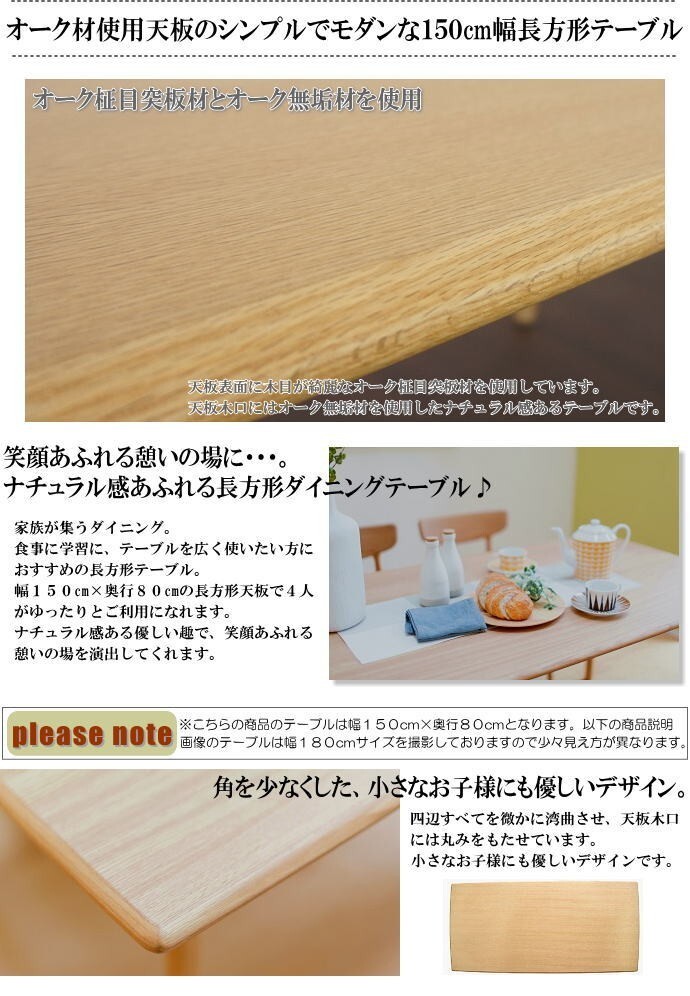 | 【商品特徴】 | ●4人掛け用幅150cm×奥行80cmダイニングテーブルの単品販売です。 ●木の温もりを感じられナチュラルモダンスタイルの空間づくりに最適です。 ・天板表面に木目が綺麗なオーク柾目突板材を使用しています。天板木口にはオーク無垢材を使用したナチュラル感あるテーブルです。 ・食事に学習に、テーブルを広く使いたい方におすすめの長方形テーブル。幅150cm×奥行80cmの長方形天板で4人がゆったりとご利用になれます。 ・四辺すべてを微かに湾曲させ、天板木口には丸みをもたせています。小さなお子様にも優しいデザインです。 ・すっきりとしたモダンなデザインの脚は、ラバーウッド無垢材を使用しています。 ・脚の底にはアジャスターが付いています。凹凸のある床でも、ネジ式で簡単に高さ調節ができ、天板の水平を保つことができます。 ・85cmの短辺は、天板より幕板が引っ込み脚間も66cmあるため、椅子に座ってのご利用が可能です。ベビーチェアーのご利用や来客時に便利です。 ・お客様で脚のお取り付けが必要となります。(説明書を同梱しております。) ※恐れ入りますが、テーブルの商品説明画像は、幅180cm×奥行85cmサイズを撮影しております。縮尺が異なり、見え方が少々異なりますのでご了承ください。 | |