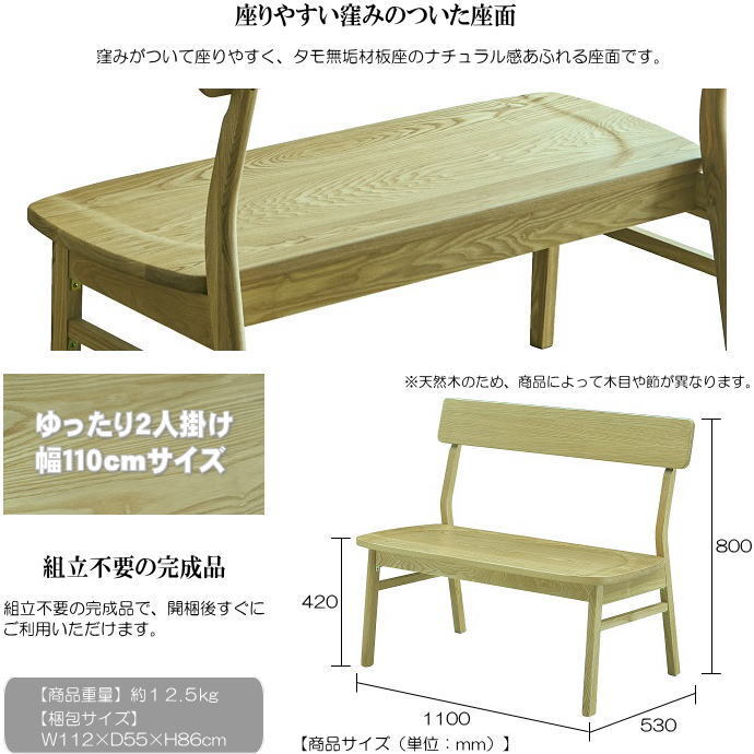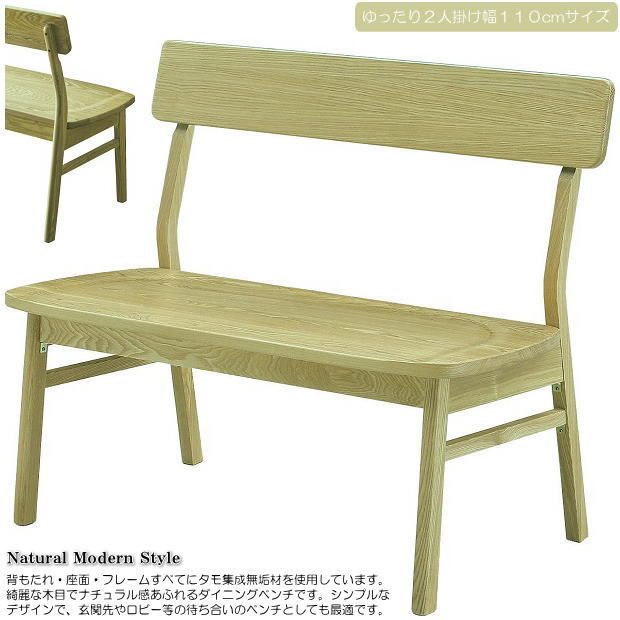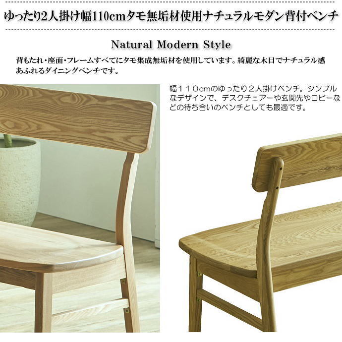 | 【商品名】 | ゆったり2人掛け幅110cmナチュラル感あふれるタモ無垢材の背もたれ付ダイニングベンチ | |