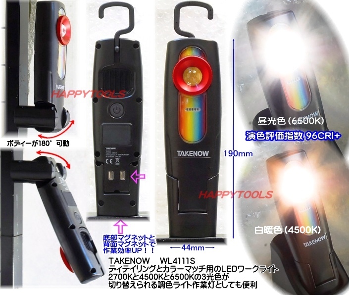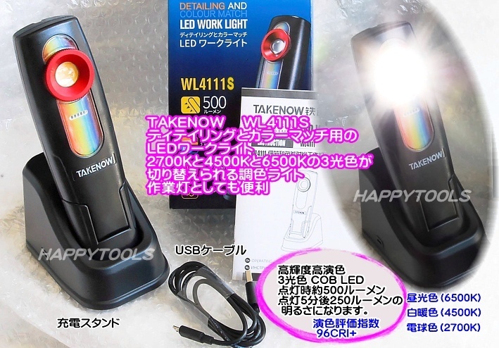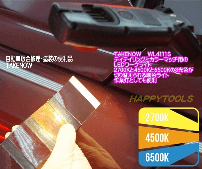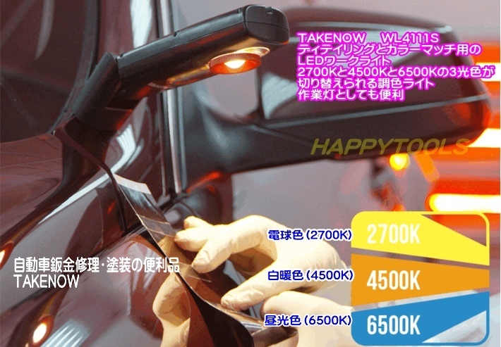 在庫有!インボイス制度対応!! ☆☆ハッピーツール大特価!注目商品!!☆☆ WL4111S TAKENOW DETAILING COLOR MATCH ディテイリングとカラーマッチ用のLEDワークライト 2700Kと4500Kと6500Kの3光色が切り替えられる調色ライトのご案内です。 塗装面の色調や磨きキズ、仕上がりのチェックに便利。 また、作業灯としても使用ができるコンパクトサイズで、防水、防塵性にも優れ 側面と底面の強力なマグネットや吊り下げ用フック、前後180度回転可能なヘッドにより いろんな箇所で使用できます。 スイッチを1回押すと電球色(2700K)に、もう一回押すと白暖色(4500K)に、更に一回押すと 昼光色(6500K)とに切り替わります。更にもう一回押すと消灯です。 高輝度高演色の3光色COBLEDは、最初にスイッチのボタンを押した時は約 500ルーメンの明るさで 点灯後5分間ほど経ちますと自動的に弱モード(約250ルーメン)の明るさに変わります。 演色評価指数 96CRI+ リチウムイオンバッテリー 3.7V 2600mAh 点灯時間 約2.5時間(強モードの時、点灯5分間後には自動的に弱モードに変わります。) バッテリー残量表示ランプ付きで充電量の目安がつきます。 USBケーブルと充電スタンドが付属。 充電時間は約4時間です。(DC 5V 1A入力時) 防水規格IP65 耐衝撃等級IK07 使用温度 -10℃〜40℃ サイズ : 重量 305g 寸法 190x56x36mm 初回使用時は、充電をして満充電の状態でご使用願います。 TAKENOW ブランド紹介 TAKENOWは高性能照明ブランドとして、ユーザー様の多くの経験を原動力として 照明技術のイノベーションを探求しており、ハイパフォーマンス・信頼・長寿命なロバスト ワークライトを開発し続けています。製品品質と技術基準はDIN(ドイツ工業規格)、ANSI (アメリカ国家規格)とGB(中国国家規格)に達しており、他のリードする業界基準を 上回っています。 ☆☆販売価格は消費税込みです。品物はもちろん新品です。送料は下記の通りです。☆☆ |