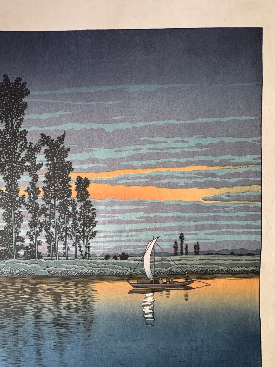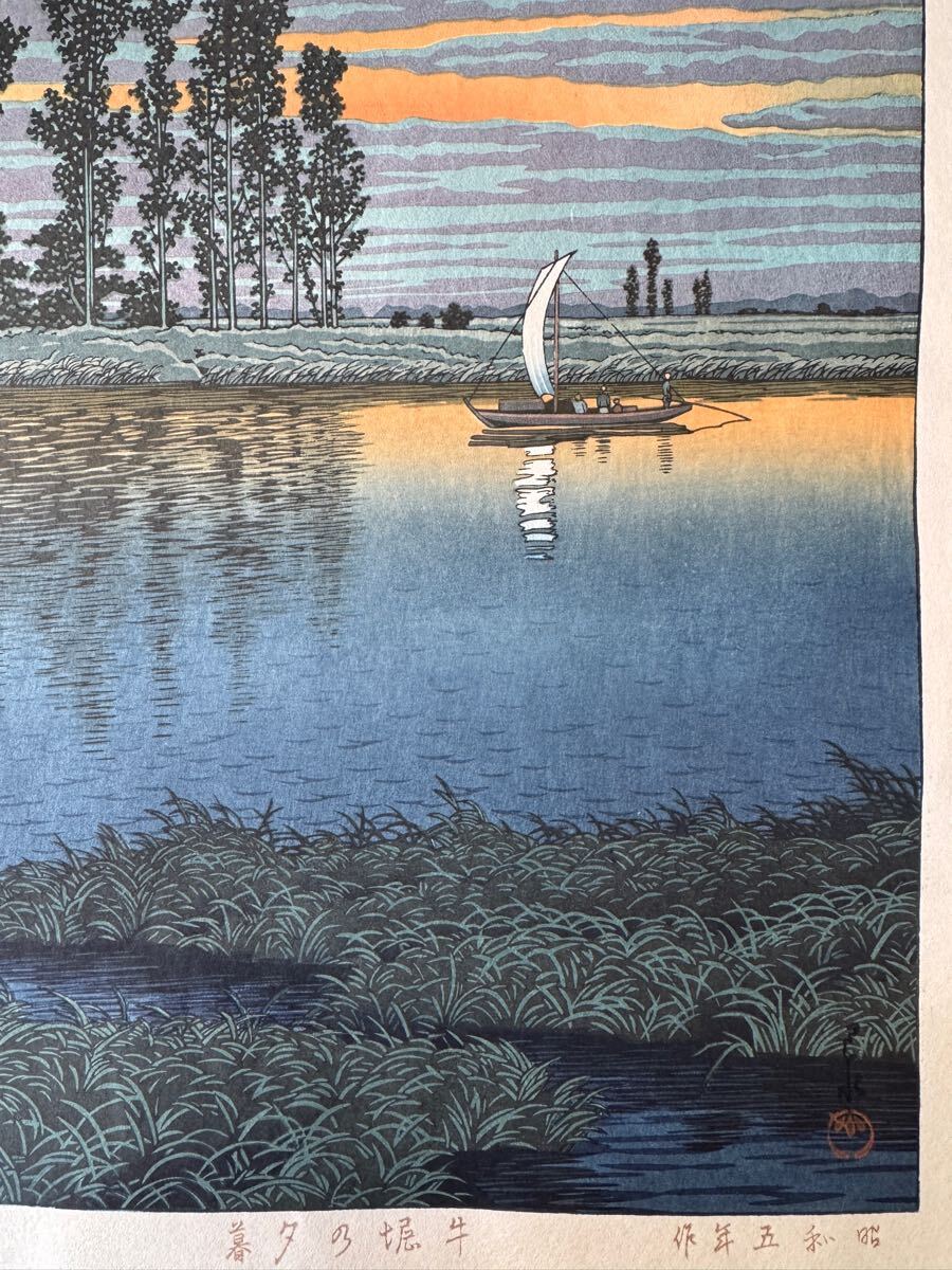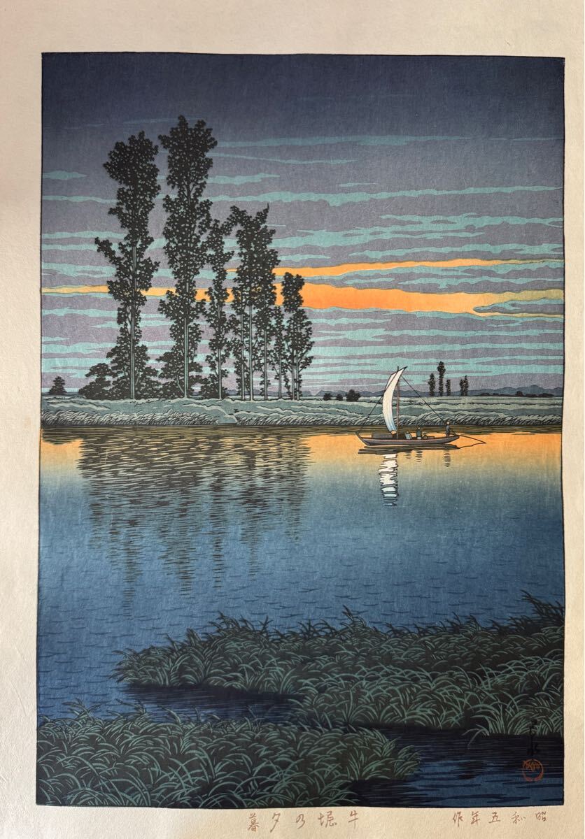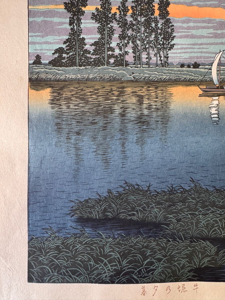 C【真作保証】川瀬巴水 牛堀の夕暮 昭和五年年作 手摺り木版画 後摺 新版画 Kawase Hasui woodblock print Shinhanga 1