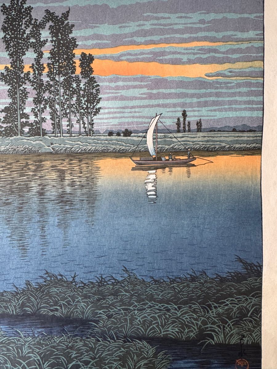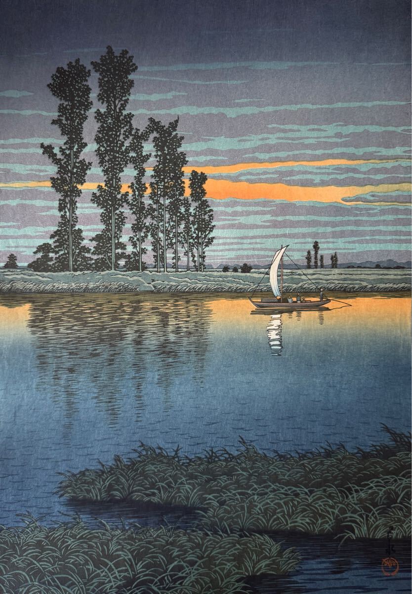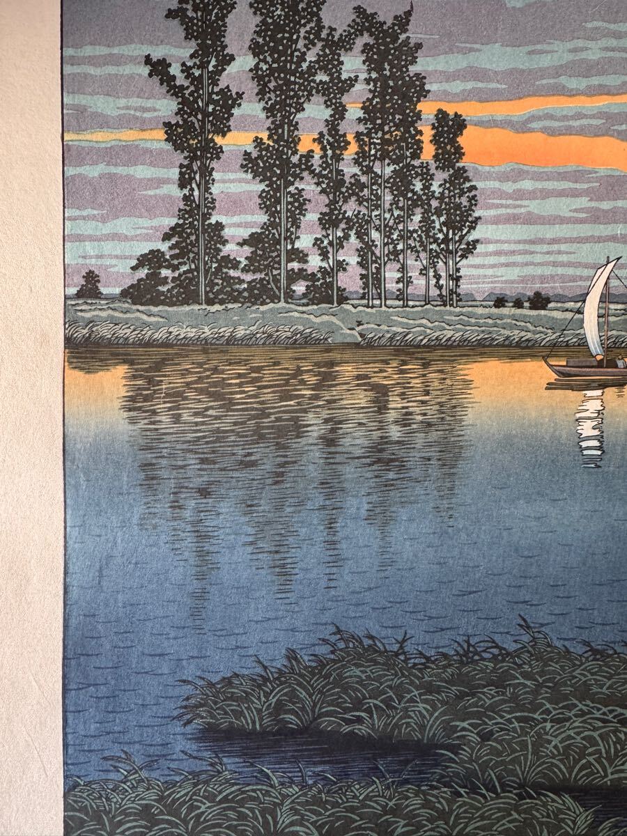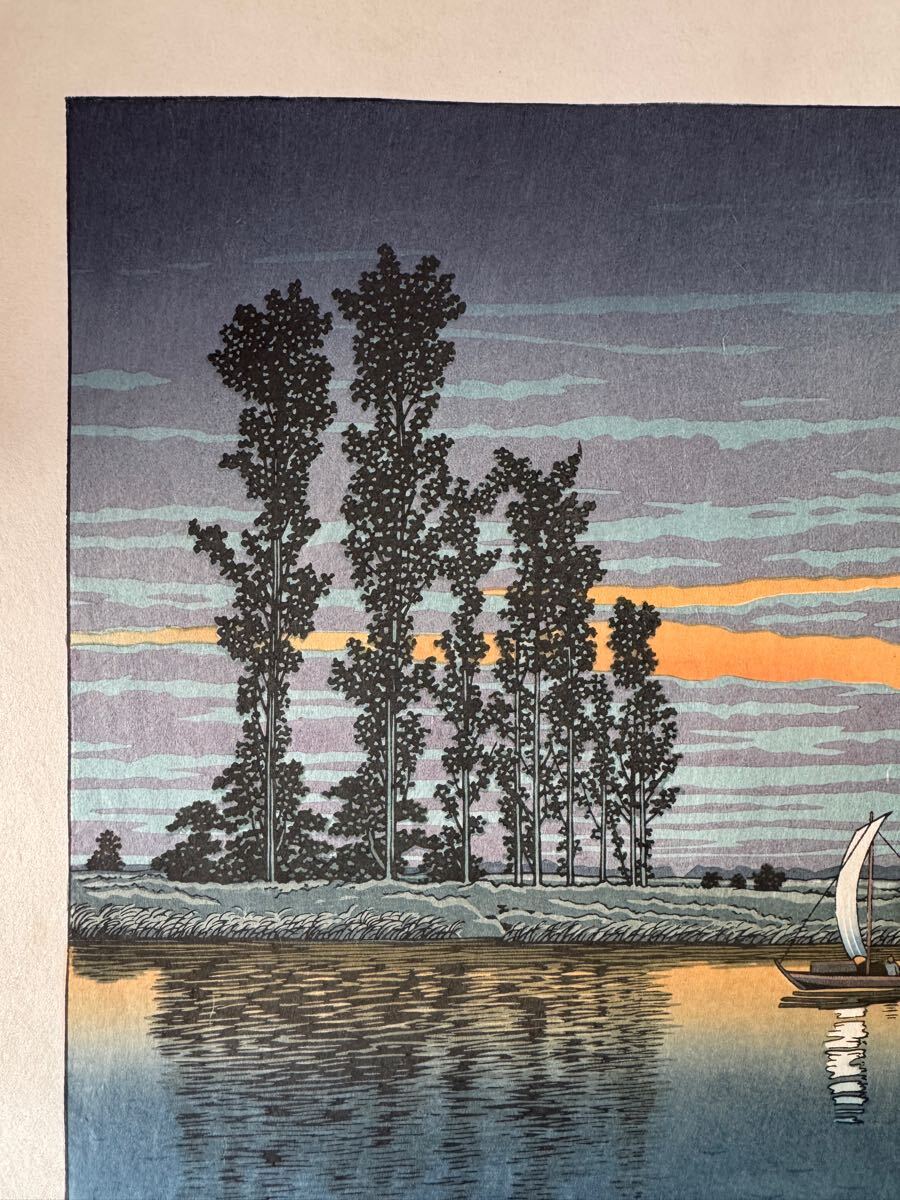 C【真作保証】川瀬巴水 牛堀の夕暮 昭和五年年作 手摺り木版画 後摺 新版画 Kawase Hasui woodblock print Shinhanga 1