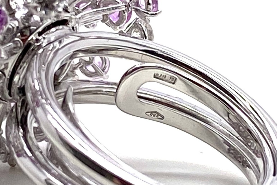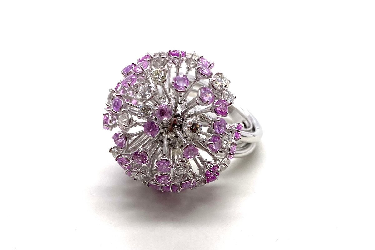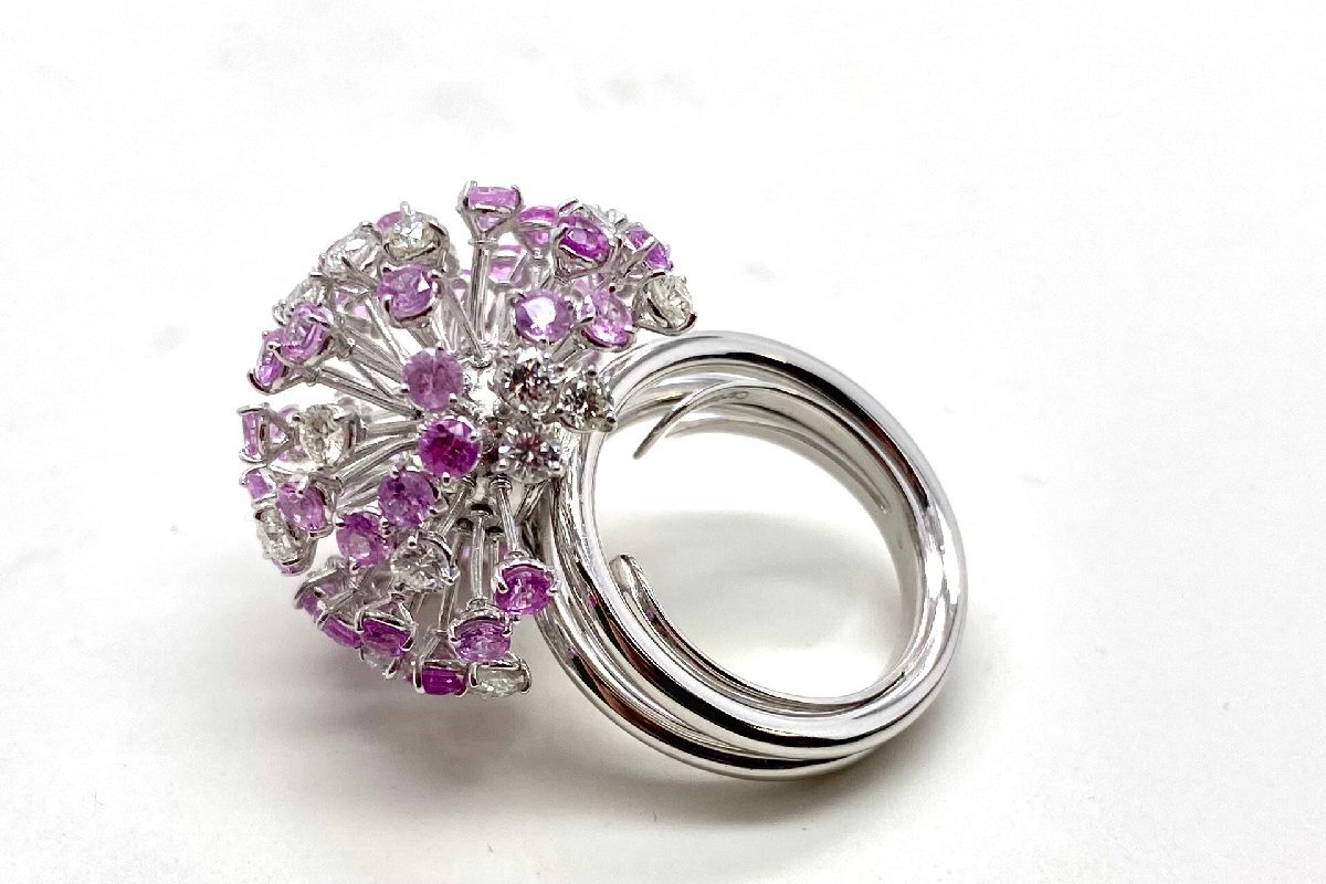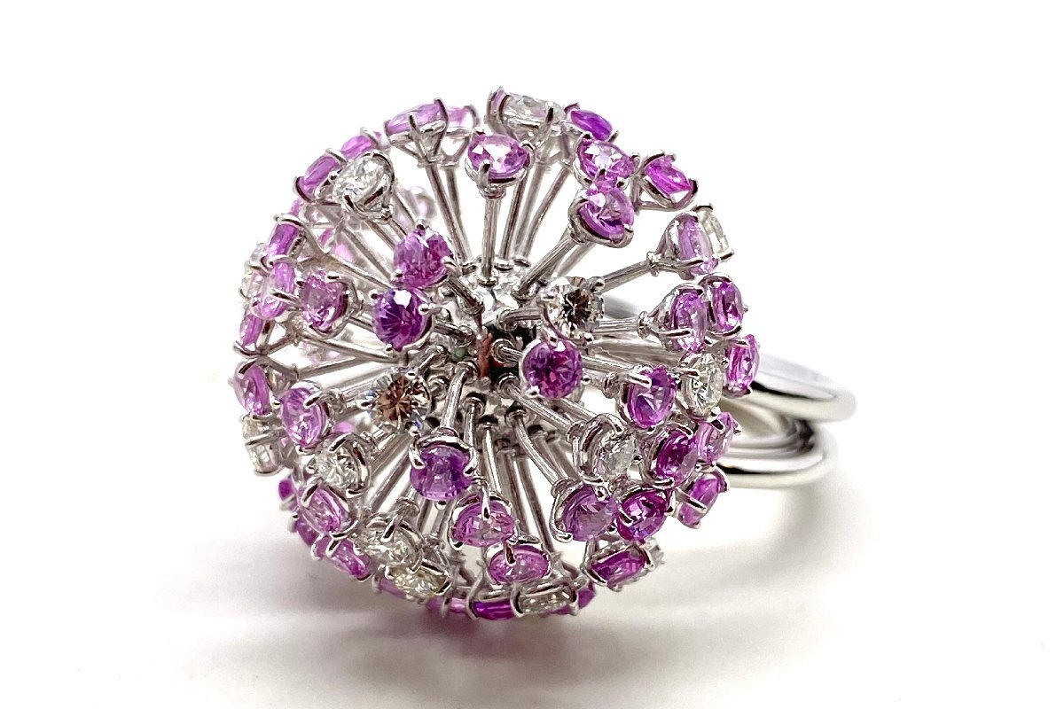 解説 | 1938年イタリア・ヴァレンツァにて創業。ブルガリ・カルティエ等へのOEM供給を担った、クチュールジュエリーブランド。1950年以降は自社名で製作を始め、各国のロイヤルファミリー御用達に・・・。当品はダンデライオン(たんぽぽ)という名のコレクション。麗しく輝く濃淡のピンクサファイヤとダイヤが、1本1本たんぽぽの綿毛となり、こんもりといしたフォルムを描きながら揺れ動きます。春の光と風をも、指元に纏うような喜びが・・・! |