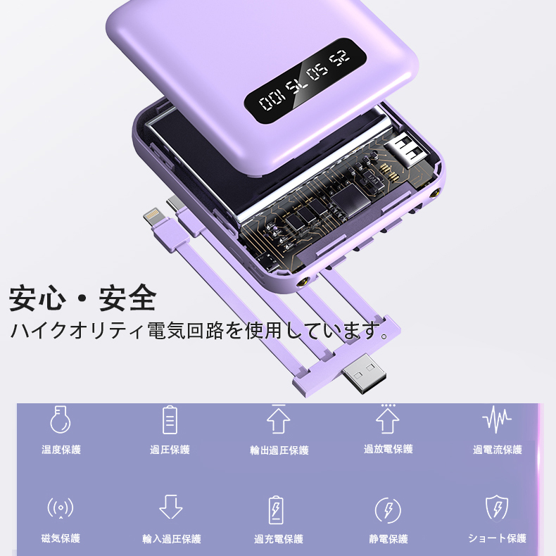 出力にはLightning、microUSB、USB type-Cの3規格出力ケーブルが内蔵された最新型のマルチケーブル内蔵モバイルバッテリーです。専用ケーブルを持ち歩く必要がなく、AndroidとiPhoneどちらにも対応出来ます。ケーブルを忘れたときも充電ができないなんて心配はいりません。更に、モバイルバッテリーの本体に充電ケーブルが内蔵されているため、USB-Aポートのある場所であれば即時モバイルバッテリーの充電が可能です。独自のスマート機能によりデバイスを自動で判別し、最適な出力で急速充電を行います。出入力とも最大2.1A急速充電可能ですから、素早く蓄電可能、より長持ちで旅先やちょっとした外出、出張の際の強い味方に最適。指紋などつきにくい仕上げ&洗練されたお洒落デザインで、旅行や出張まで幅広くお使いいただけます。外郭は高度的抗酸素難燃材料を使用し、省エネの上発熱しにくい。LED懐中電灯としても利用でき、非常時の電源や照明としても利用できる。フル充電の場合は、最大120時間持続点灯してキャンプや災害だけでなく、散歩や夜道を歩くのにも使える。商品内容:モバイルバッテリー*1サイズ:約9*8*2CM重量:約190g取説無し★落札後、取引手続きへお進みください。 商品のご指定できる場合は取引メッセージでご指定ください。 取引メッセージ以外のご連絡は対応できません。