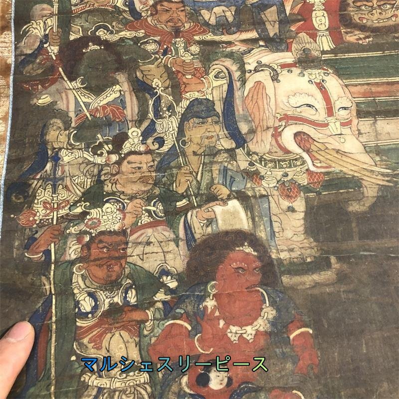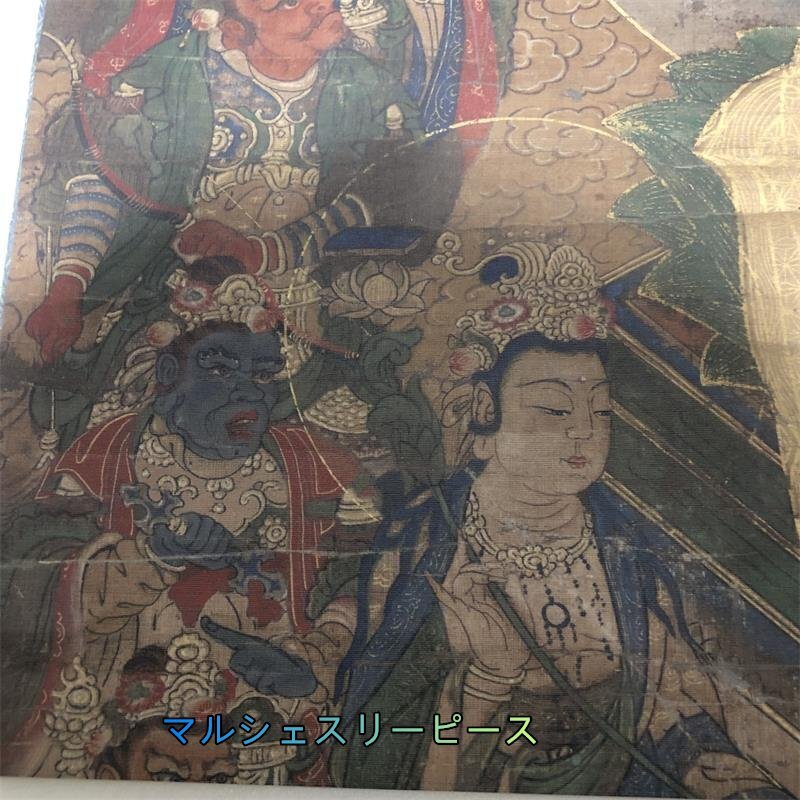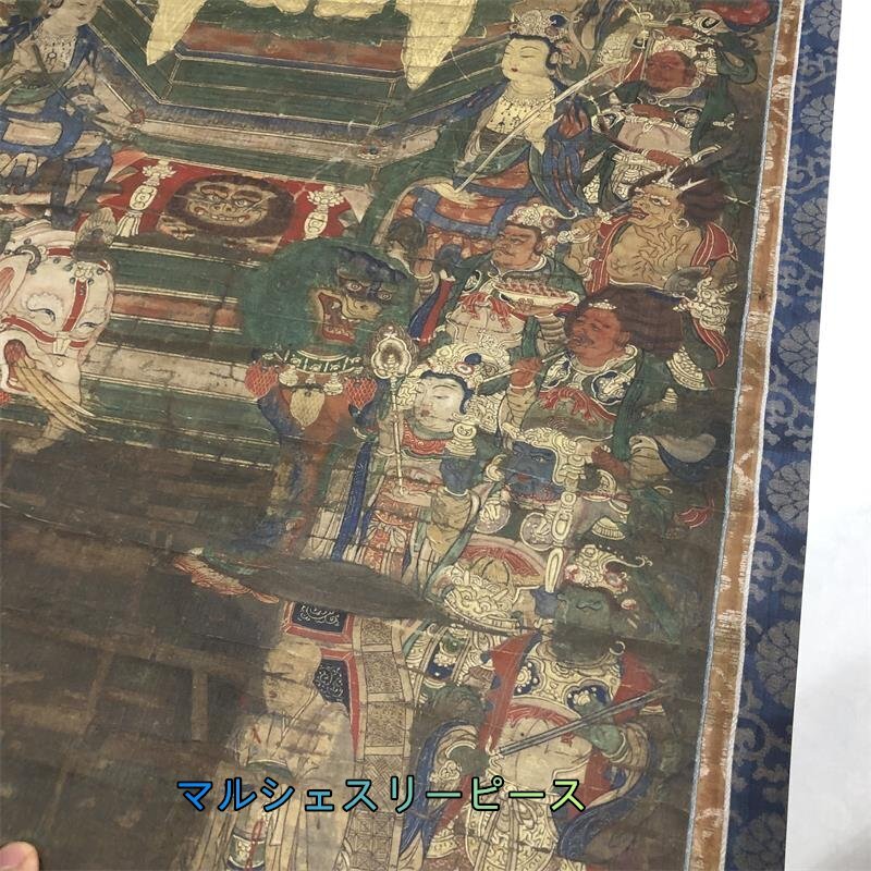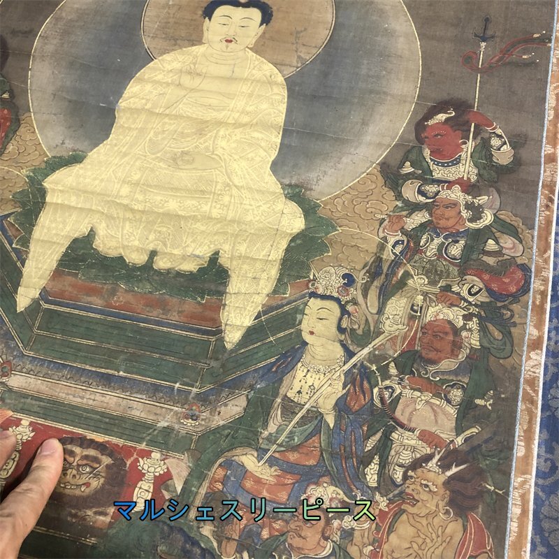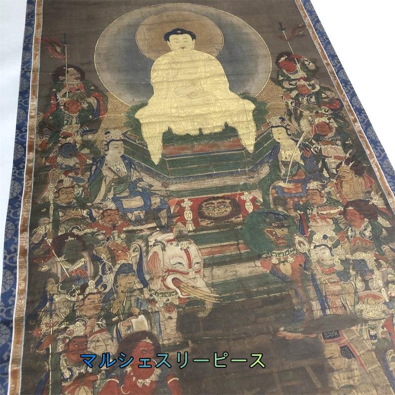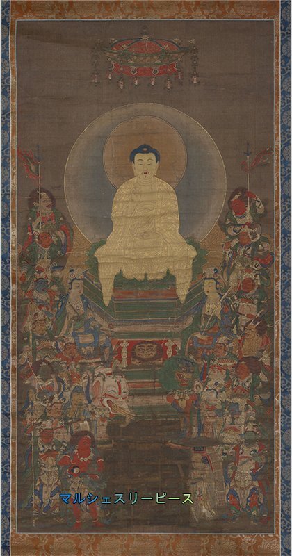 日本 室町前期 釈迦十六善神像図 釈迦図 仏像 阿弥陀仏 縦幅 釈迦絹布 絹本 中堂画 掛け物 未表装Y38133
