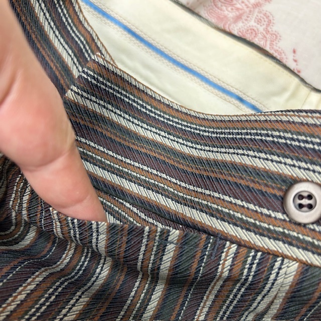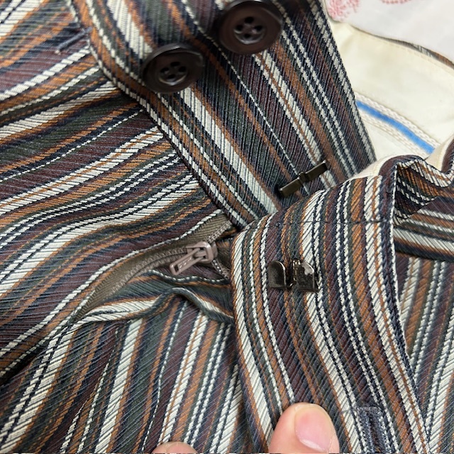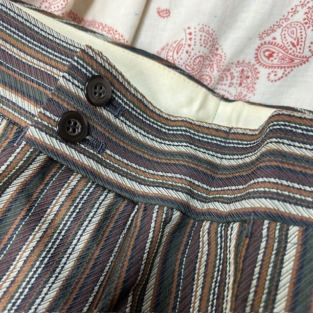 ●商品説明・・・60年代~70年代頃のオールド・ヴィンテージの国産レトロなストライプ柄の薄手のサマースラックパンツです。裾がフレア強めのベルボトムです。60s~70s初め頃の股上浅め(ローライズ)のすっきりしたシルエット感です。素材はポリエステルで、薄手の春夏秋向けな感じです。サイズ表記は70で、XS~S程度のサイズ感かと思います。