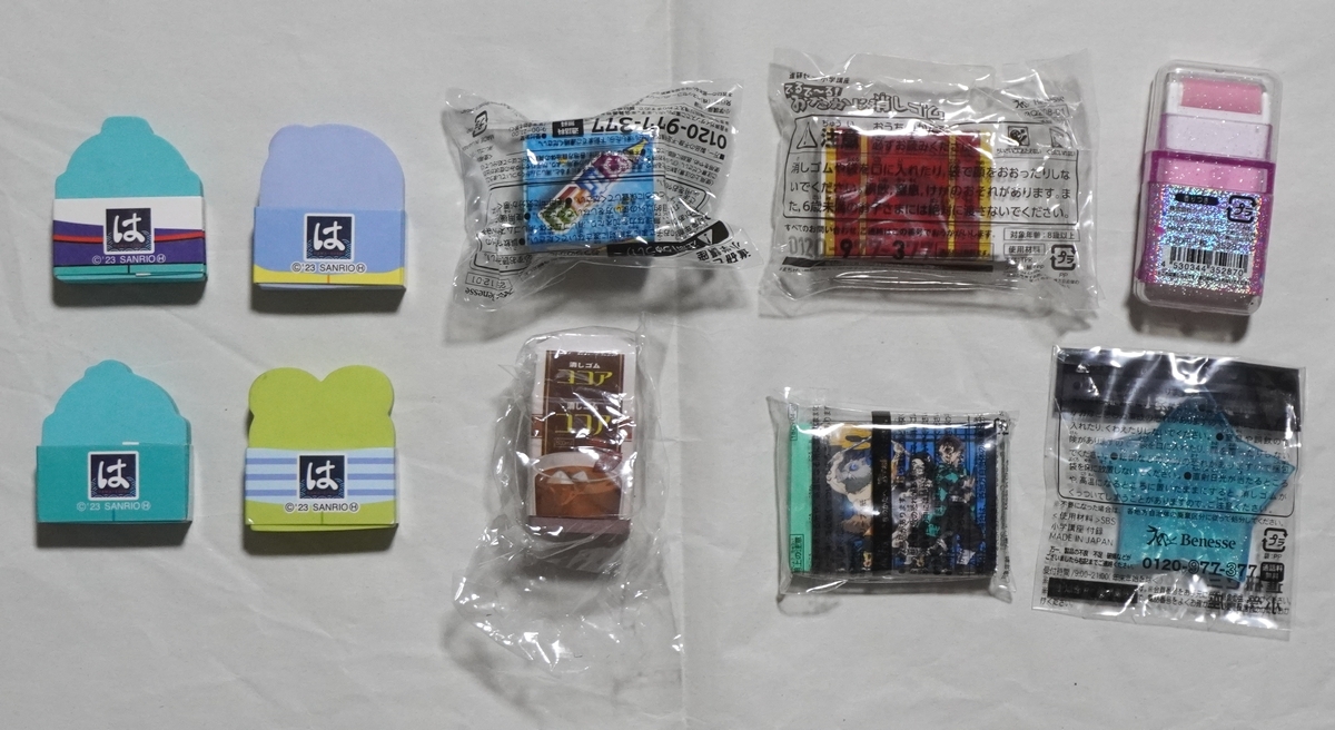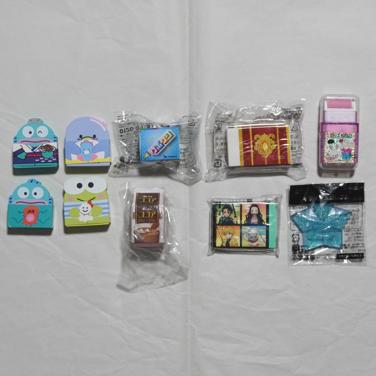 【はま寿司SANRIO/サンリオ】ハンギョドン、タキシードサム、けろけろけろっぴ、【進研ゼミ小学講座】サポケシ、おたから消しゴム、鬼滅の刃、キラッシュ消しゴム、ココア消しゴム、ローラー消しゴム