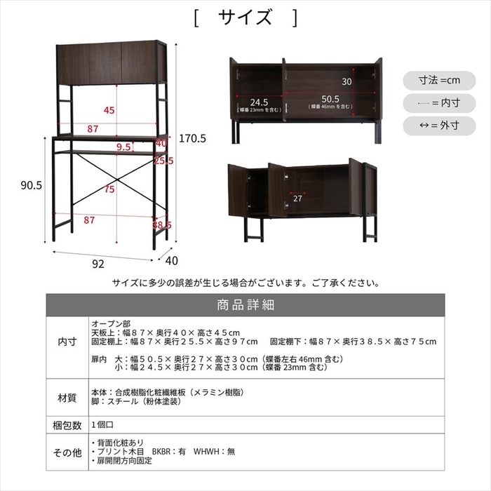 | [内寸] (天板上)幅87×奥行40×高さ45cm (固定棚上)幅87×奥行25.5×高さ9.5cm (固定棚下)幅87×奥行38.5×75cm (扉内)幅87 ×奥行27×高さ30cm (作業面)幅87×奥行40×高さ90cm |