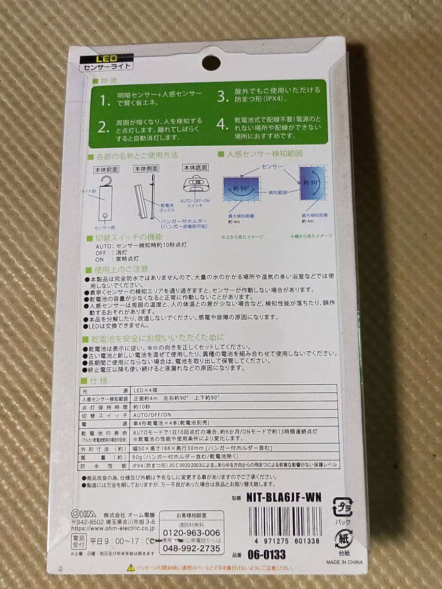 OHM オーム電機 LEDセンサーライト 人感 NIT-BLA6JF-WN 未使用品? No.② H-4