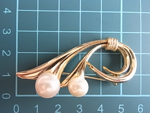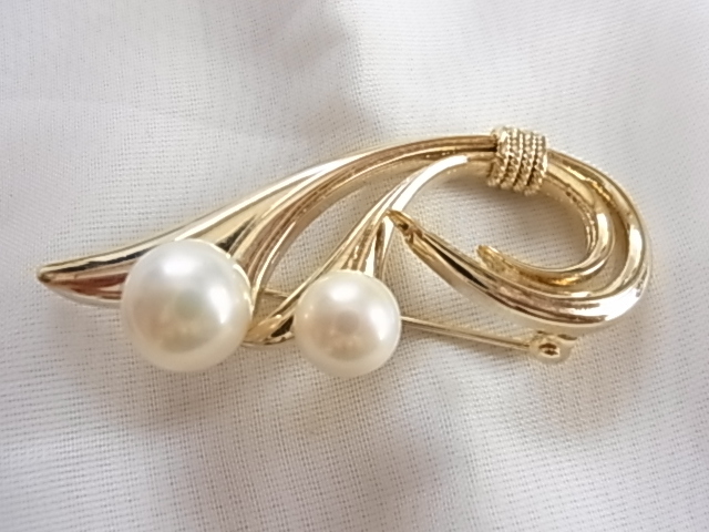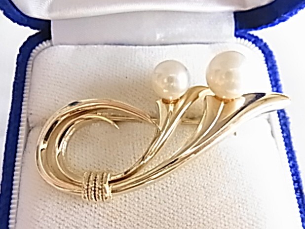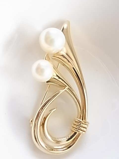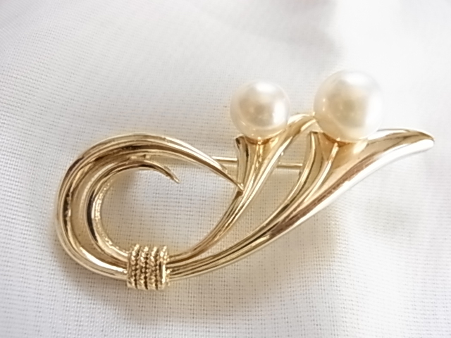■ビンテージ/ヴィンテージ パールストーンが2粒 fakeパール カーブのシルエットが美しいデザイン ゴールドトーン豪華感ブローチ