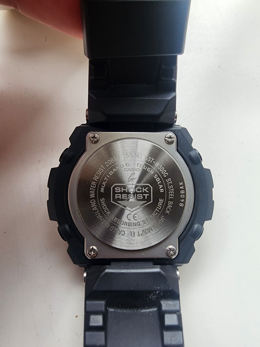 裏蓋には「ST-W300G ST.STEEL BACK JAP MOV'T EL 5524 SHOCK RESIST CE CASED IN THAILAND WATER RESIST 20BAR」などの表記がある。