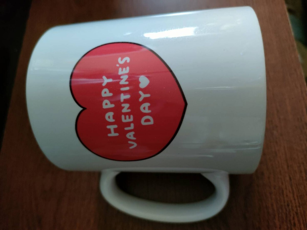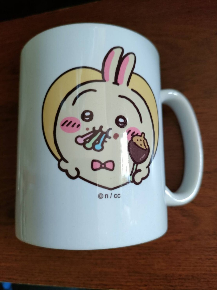 うさぎキャラクターとバレンタインメッセージがデザインされたマグカップ。