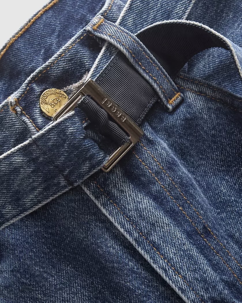 伝統的なバックポケットの上にウェルトポケットを加え、片側がデニム、もう片側がグログラン生地のリバーシブルベルトが付属する。