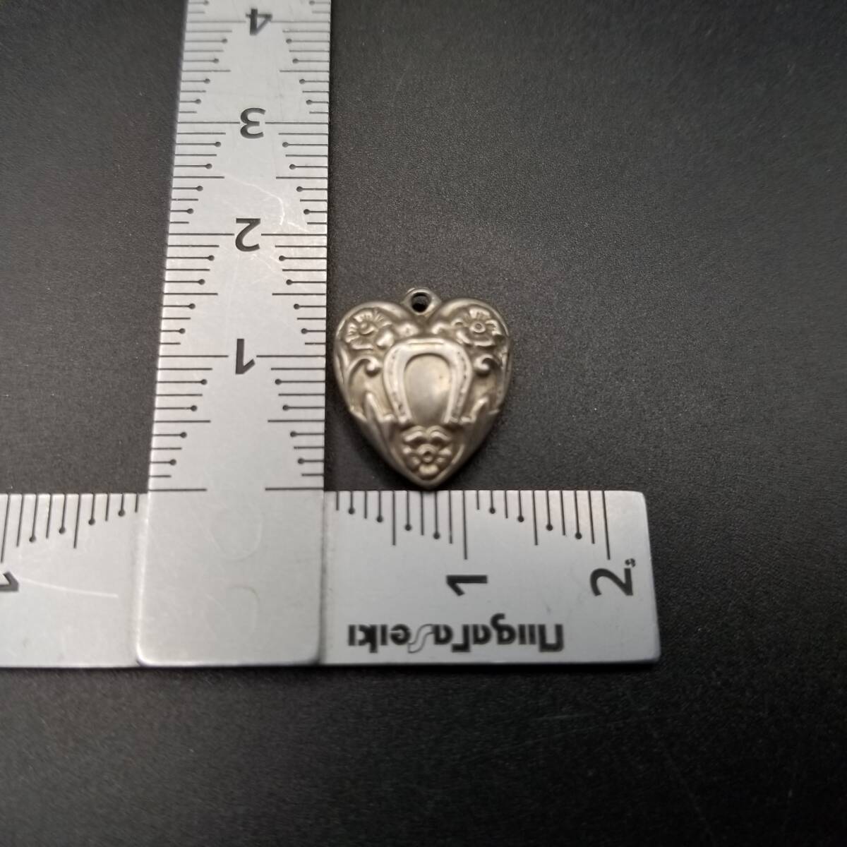 WWII期 花とホースシュー ヴィンテージ パフィーハート 925 シルバー チャーム 銀 ペンダントヘッド フローラル 彫金 Sweet Heart Y22-E
