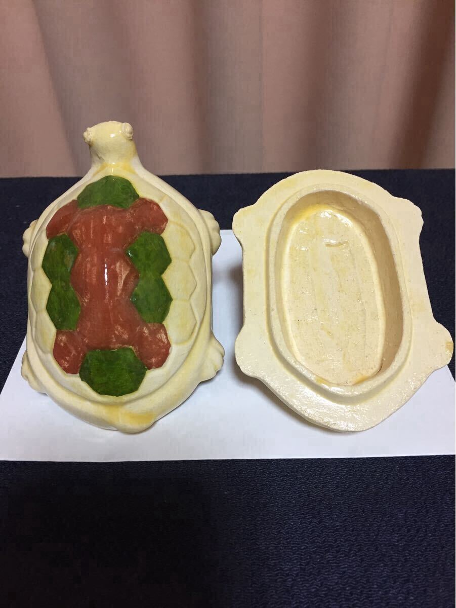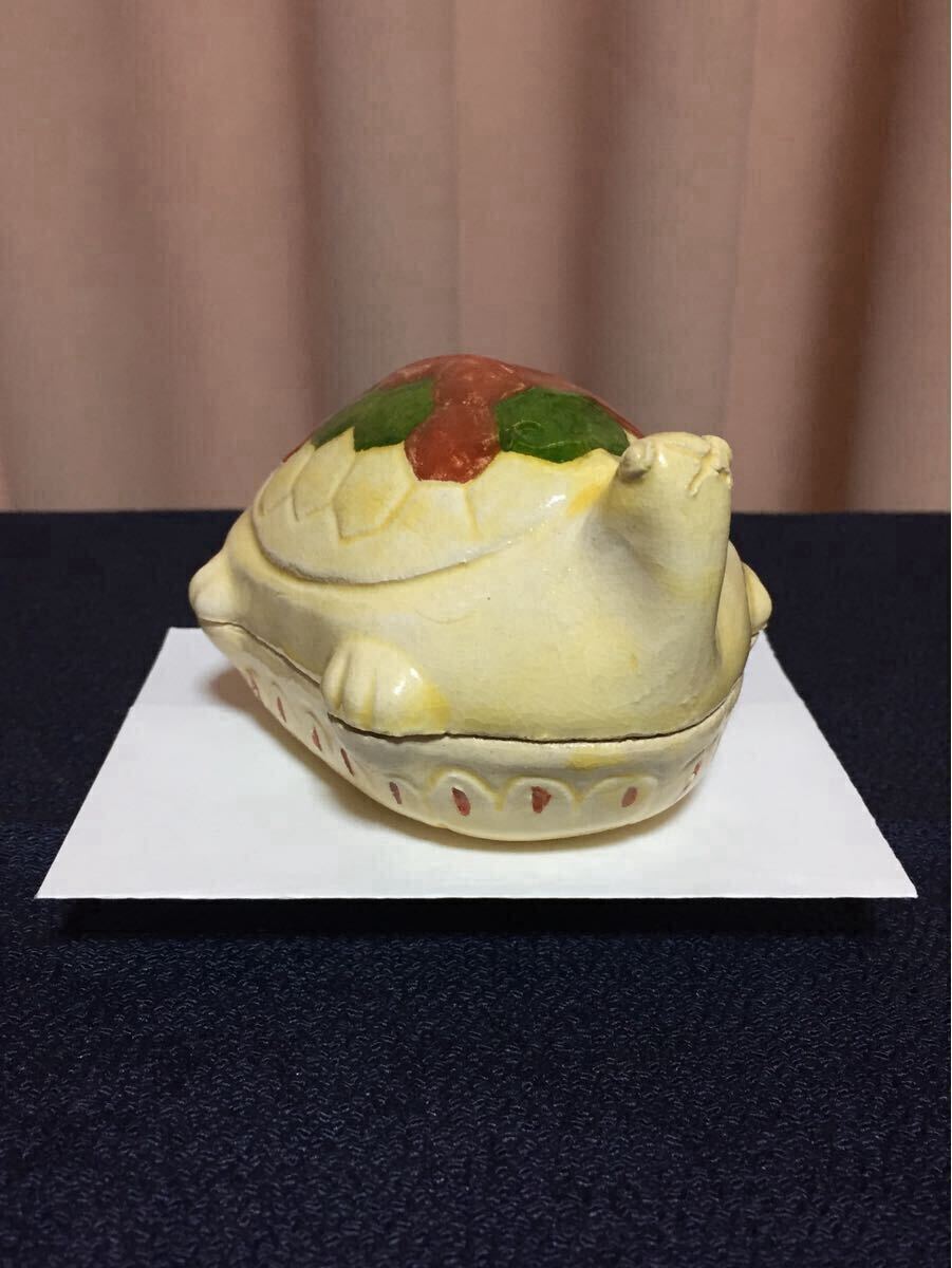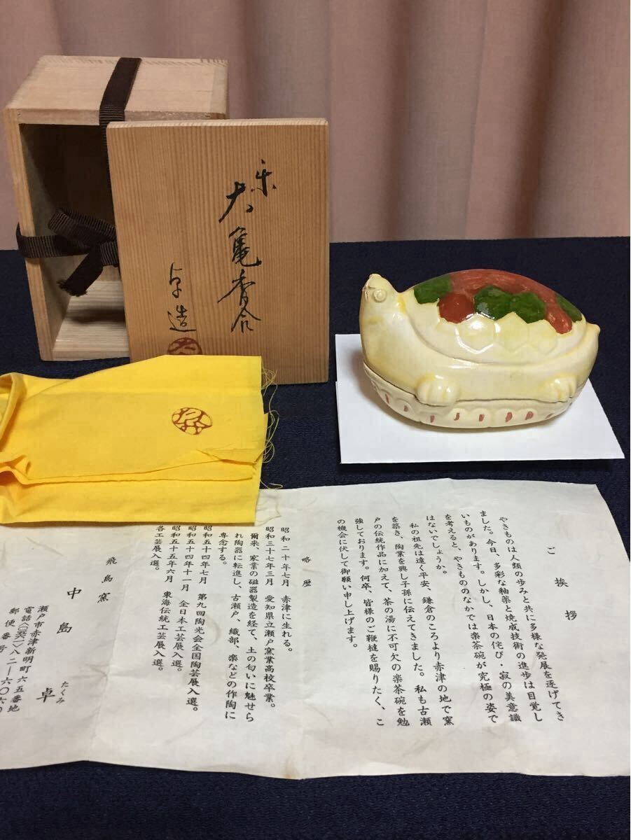 中島卓 楽 亀 大亀 香合 楽焼 黄釉 瀬戸焼 赤津焼 飛鳥窯 縁起物 吉祥 開運 鶴亀 長寿 寿 瑞気 共箱 共布 しおり 美品 中島 卓 たくみ 小物入 置物 景物