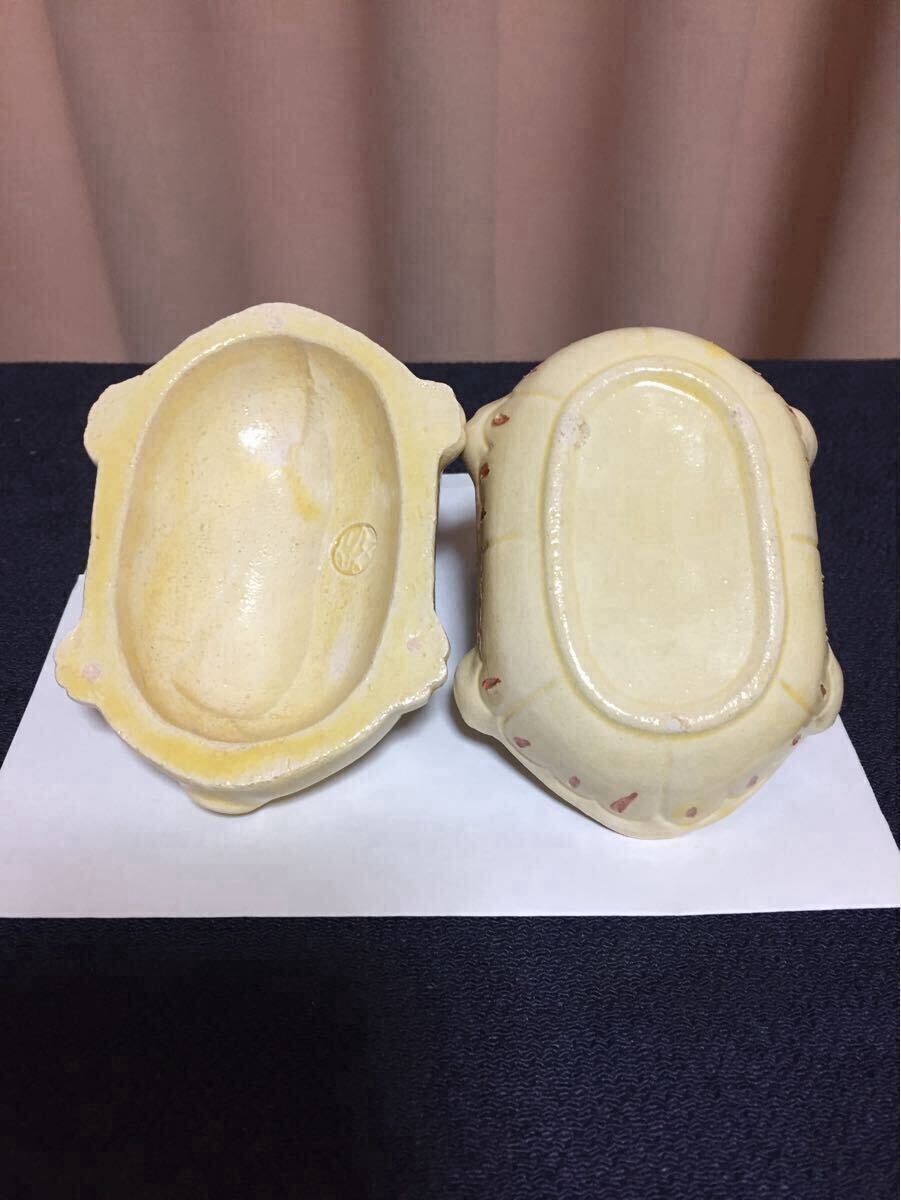 正月などの香合としては ぶりぶりや羽子板などが有名で、色絵金彩の華やかさが いやが上にも目出度さを感じさせます。一方で 専門書には 正月の“いの一番”に この大亀香合が据えられていました。正月に “大亀” と言うのも古風で奥ゆかしい選択だと感じられます。薄めの黄釉による楽焼の作品で、グッと落ち着いた雰囲気が何よりの特徴と言えましょう。亀ですので 長寿のお祝いにも好適です。取り合わせにより この様な穏やかで控え目な “亀” もまた◎で、結構だと考えます。
