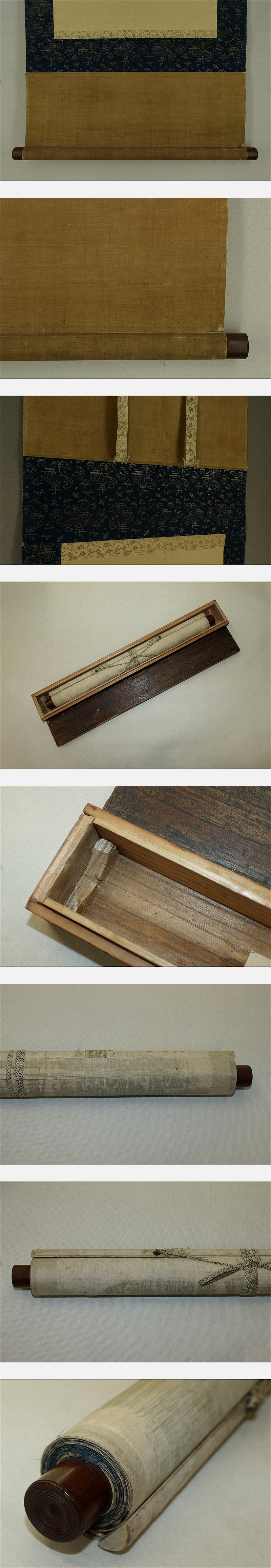 英一蝶 はなぶさ-いっちょう(1652-1724) 江戸前・中期の画家。京都の人。 江戸に出て狩野安信に師事し多賀朝湖と称したが, 幕府の怒りに触れて伊豆三宅島に流された。 赦免後,英一蝶と改名。軽妙な筆で市井の風俗を描いた。俳諧・書もよくした。 本紙は、染み、汚れ、強い折れ、皺、虫食い、擦れ、破れ痕があります。 表装は、染み、汚れ、強い折れ、皺、虫食、破れ、ほつれ、ヤケ、擦れ、修復痕 箱に破損があります。 【サイズ】 作品 横約35cm×縦約105cm 表装 横約47cm×縦約189cm |