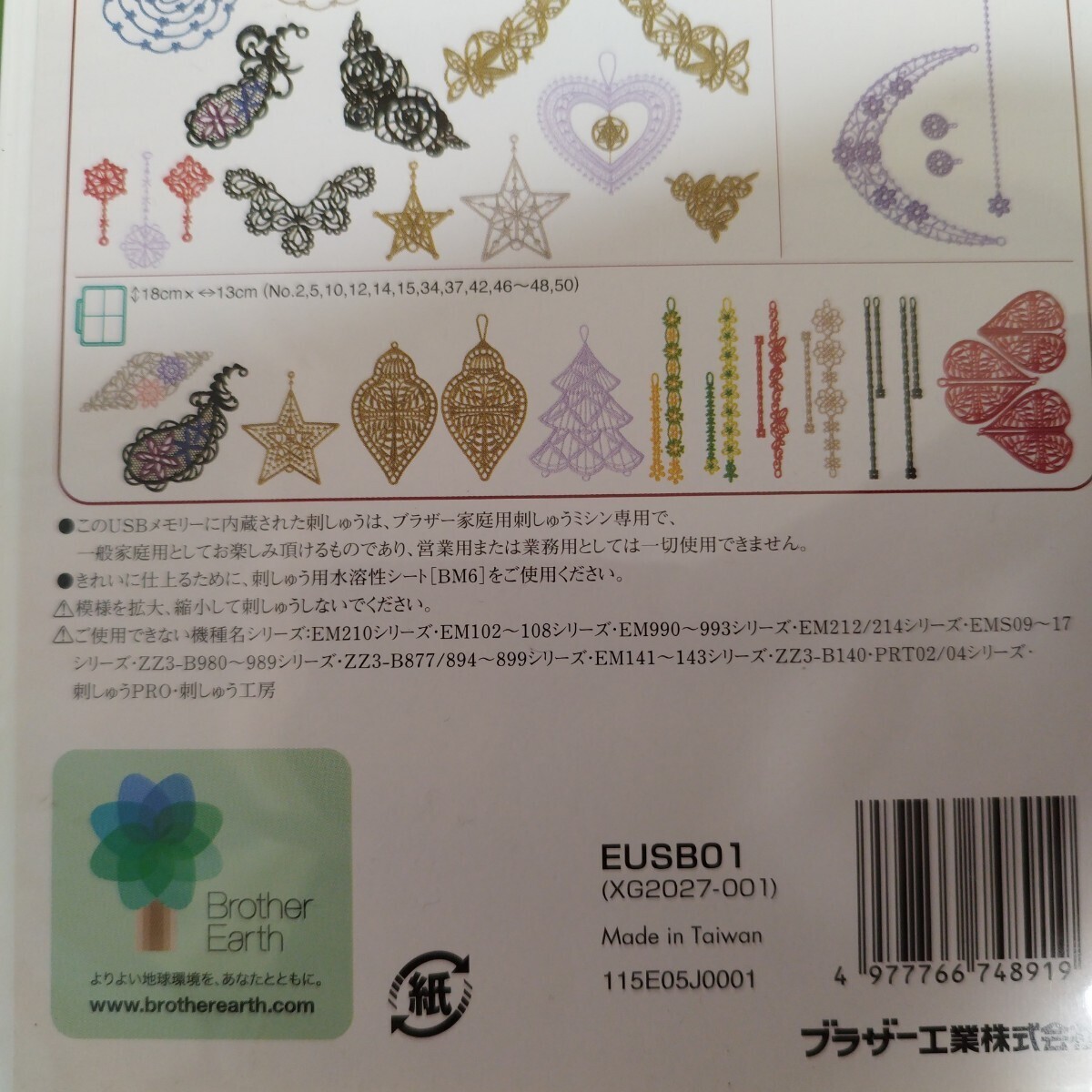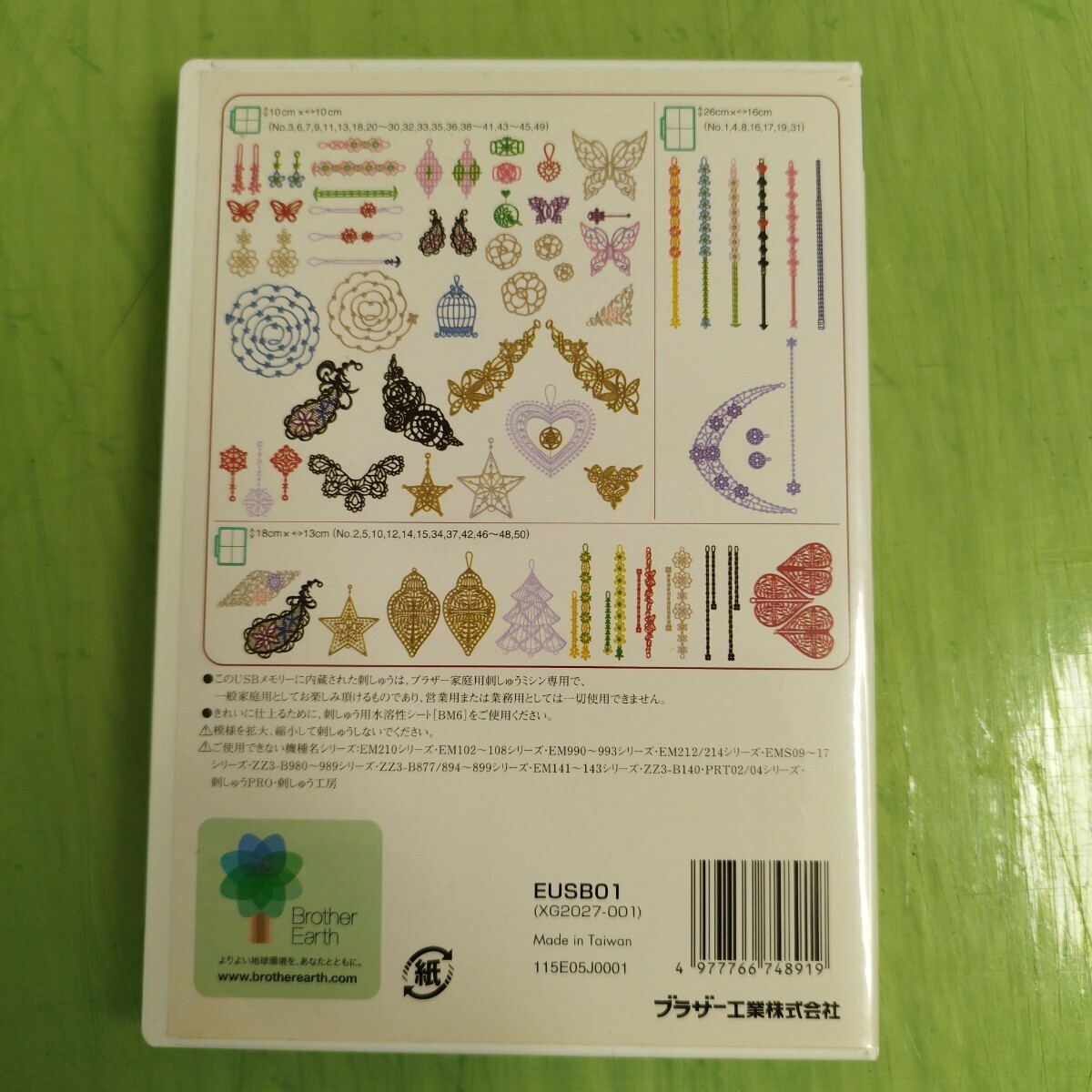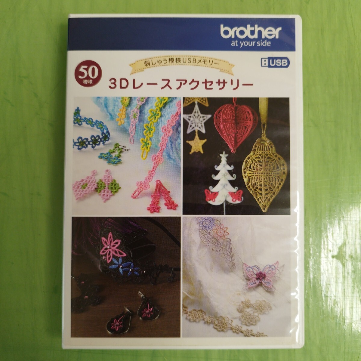 ブラザー刺繍ミシン用3Dレースアクセサリーのデータソフト。刺繍ミシンのUSB差込口に直接さして使用します。刺繍PROなどで、データをいじることは出来ません。使用出来ない機種もあるようですので、写真の4枚目をご参照下さい。ちなみにブラザーの刺繍ミシンPRでは、問題なく使用出来ました。