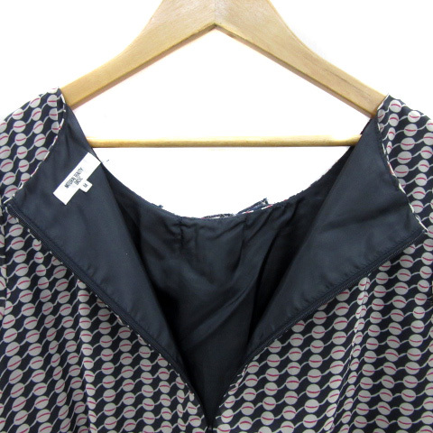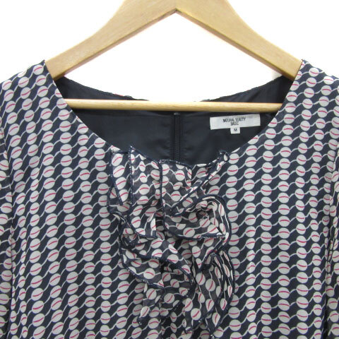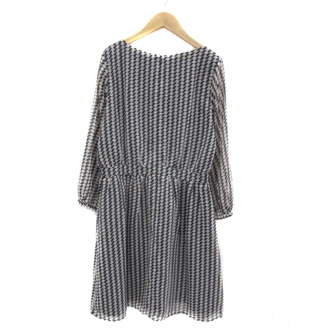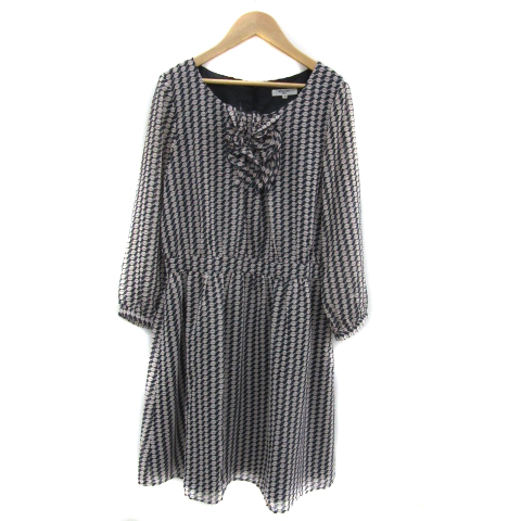 ナチュラルビューティーベーシック ワンピース ひざ丈 長袖 ラウンドネック 総柄 フリル M マルチカラー 紺 ネイビー レディース