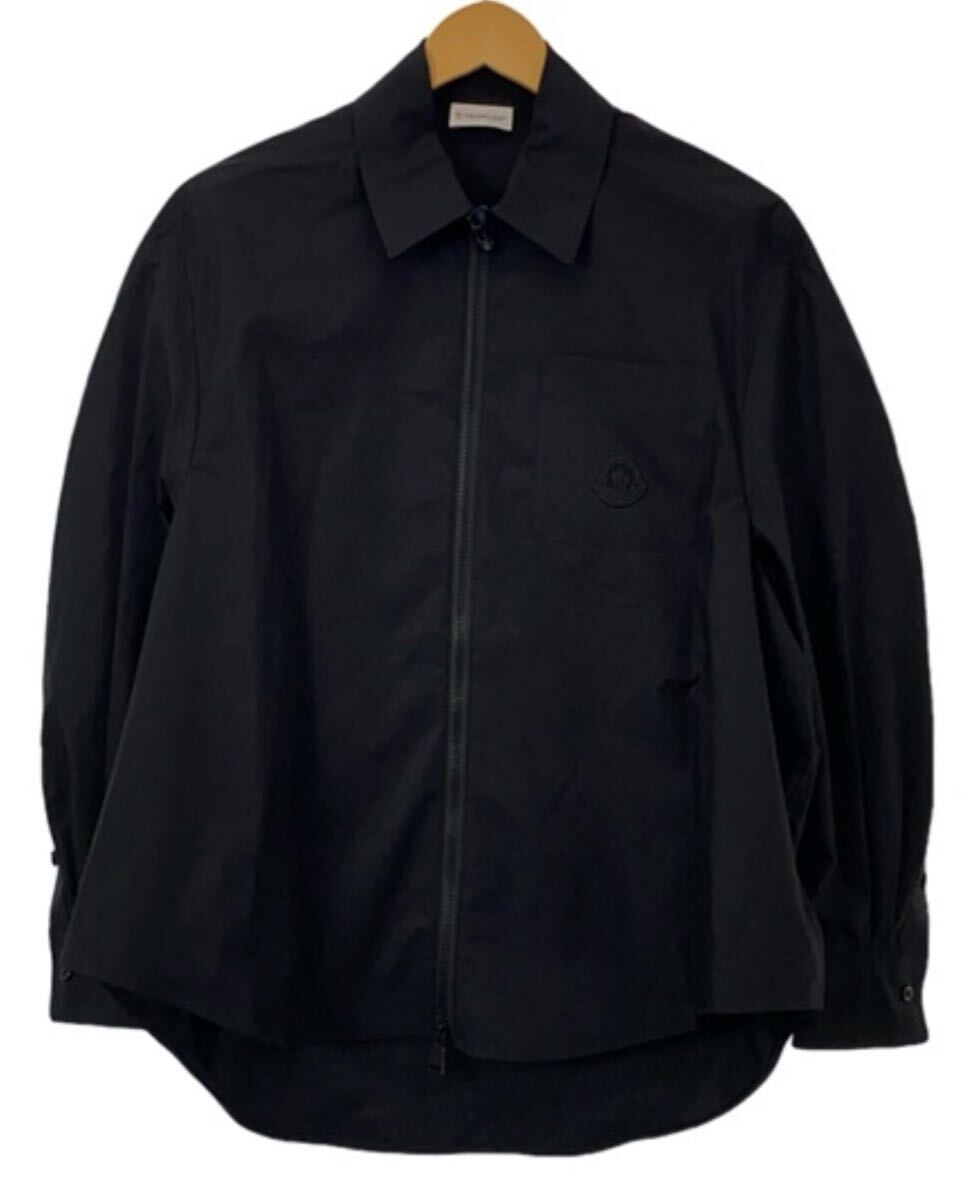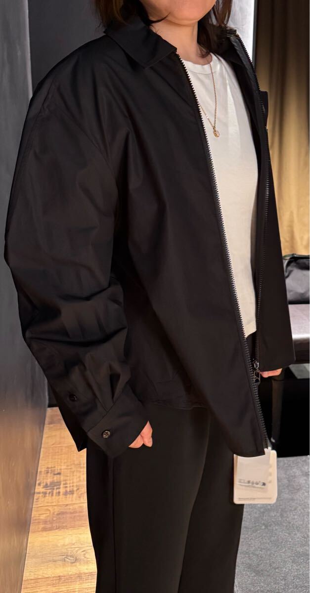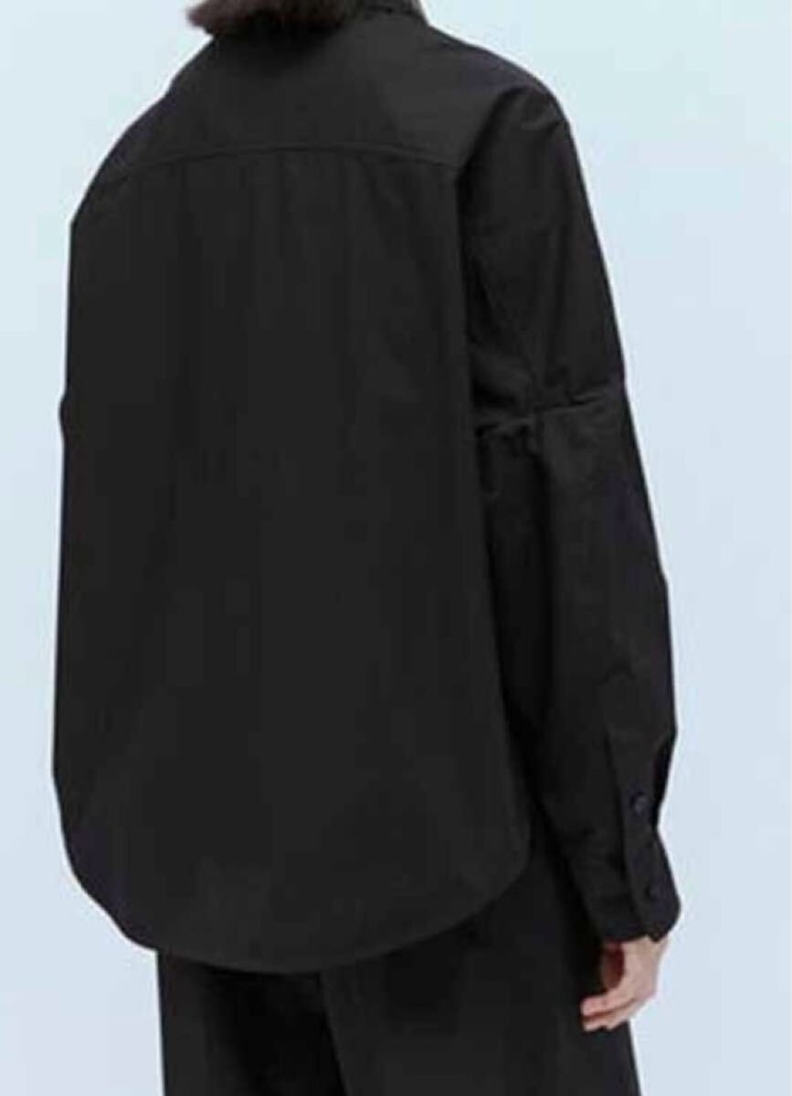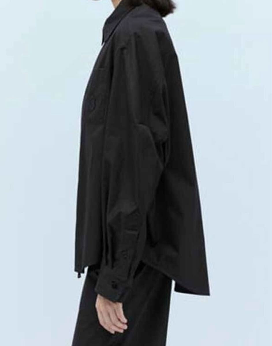 オーバーサイズの黒シャツ、フロントポケット付き。