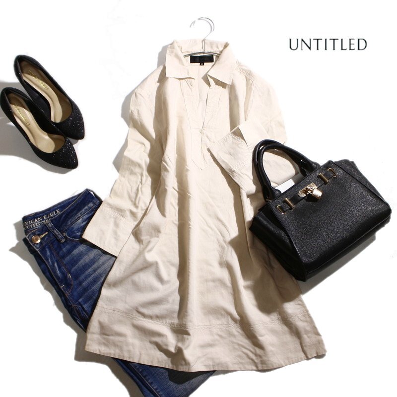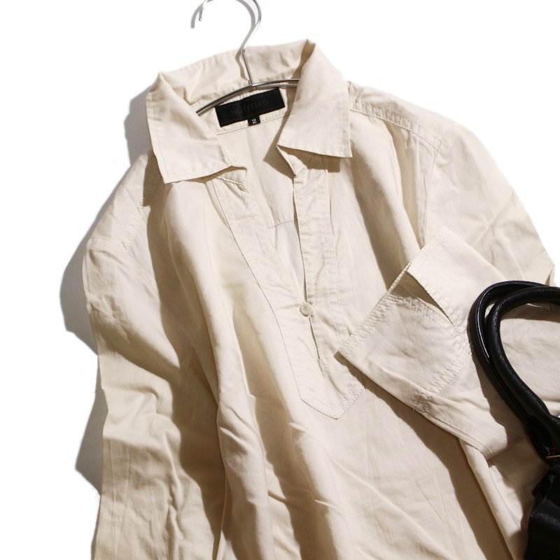 美品 アンタイトル UNTITLED 株) ワールド 透け オーガンジー 春 夏 ロング丈 シャツ生地 襟 ロングカットソー 9号 2 ベージュ スキッパー