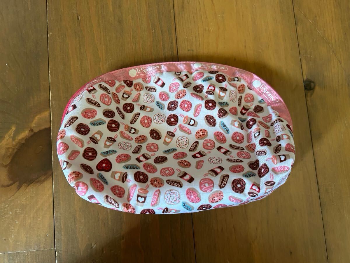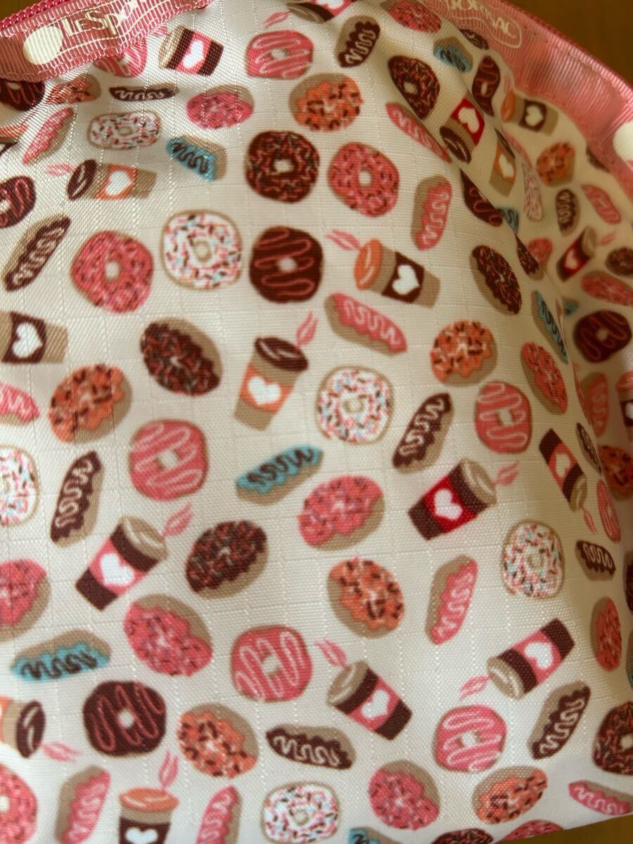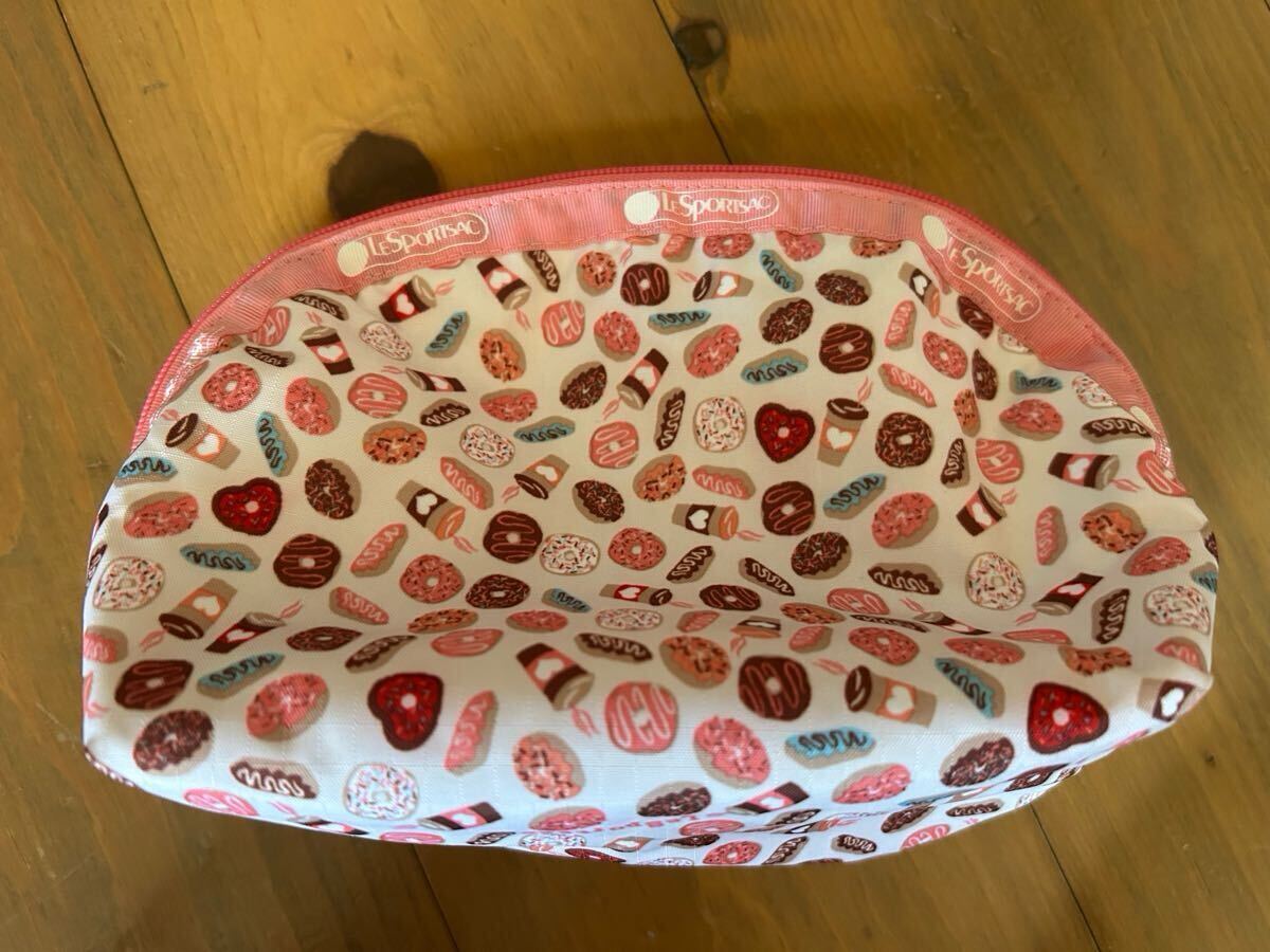 レスポートサックのドーナツ柄ポーチです。サイズは縦約14センチ横約20センチ底幅約7.5センチです。タグはありませんが、未使用品です。ノークレーム・ノーリターンでお願い致します。