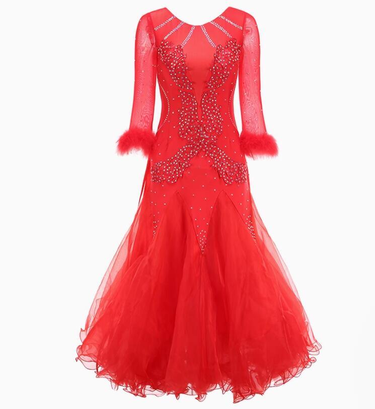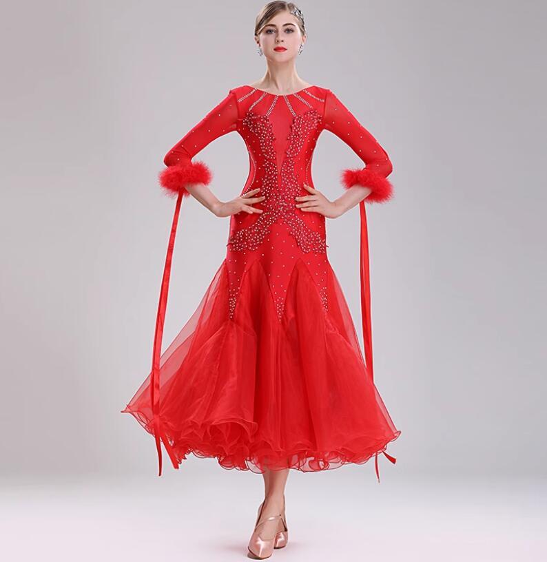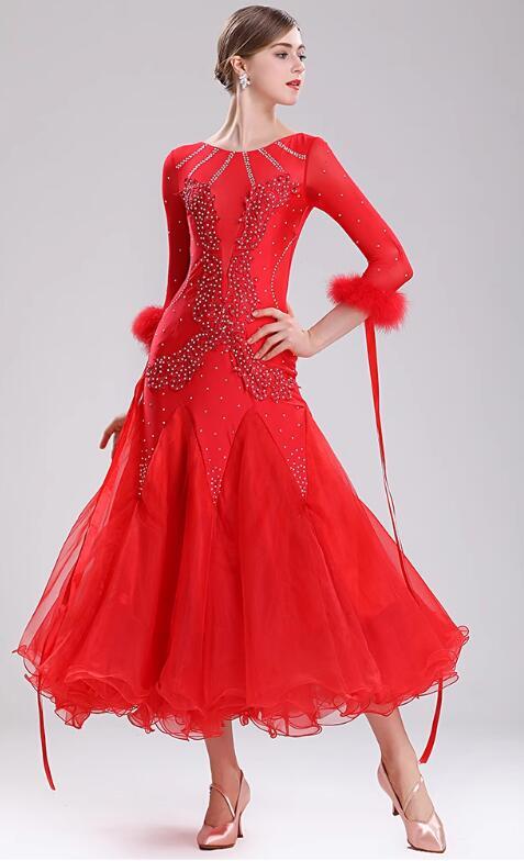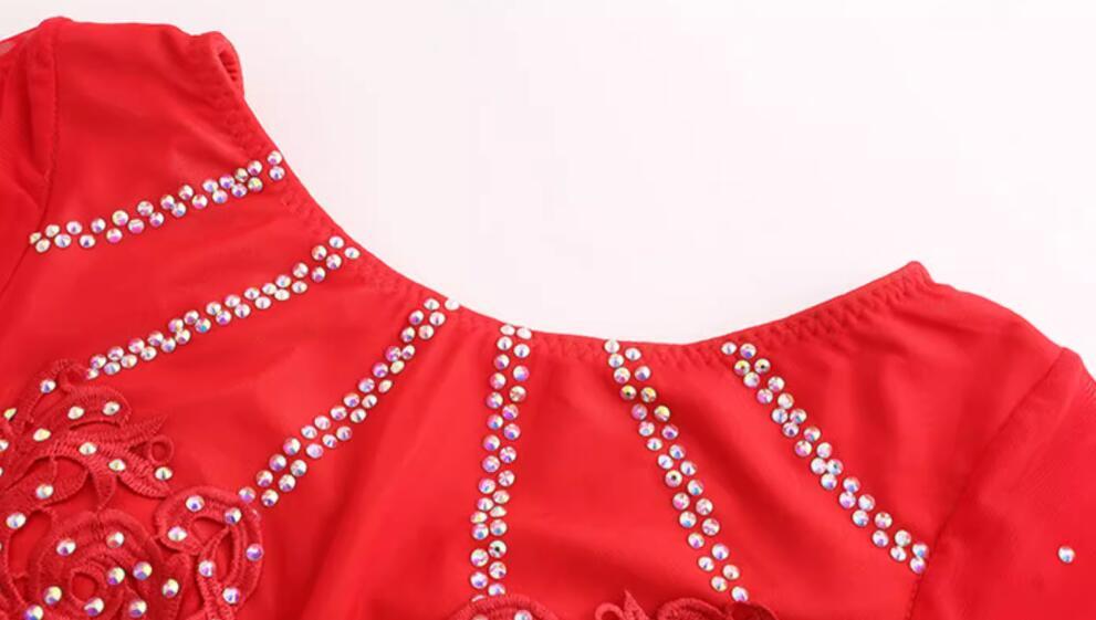 新品レディース社交ダンスドレス ワルツ系競技ドレス 可愛い花柄ロングワンピース 可愛いレッド サイズS~XXL