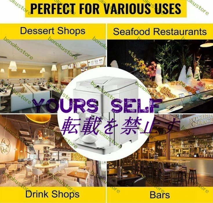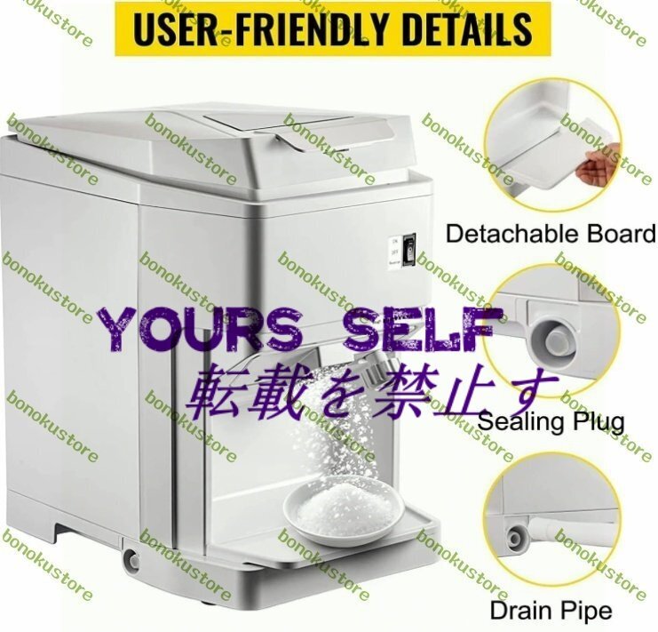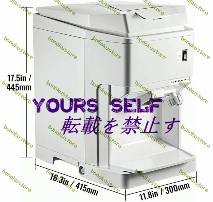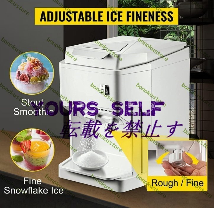 商品の説明特徴:目を楽しませてくれる見た目とパワフルな性能が特徴の電動アイスシェーバー。内蔵の 250W 銅モーターにより、1 時間に 265 ポンド (120 kg) の氷を砕くことができ、比較的短時間で柔らかくふわふわした粉状の雪氷を提供します。細かさ調整ツマミ、リバース機