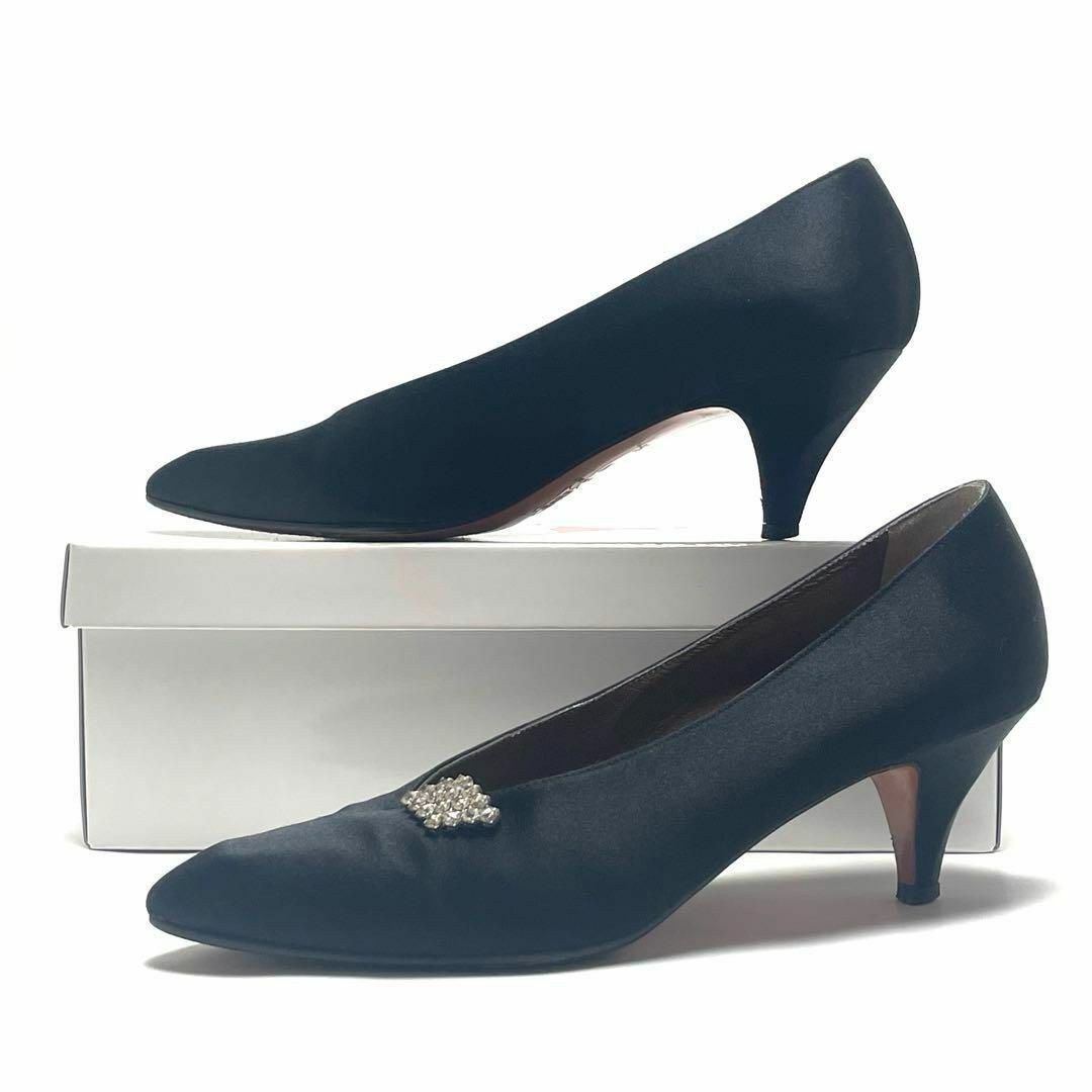 ■モデル:ワンポイント ラインストーン付き ブラック サテン パンプス