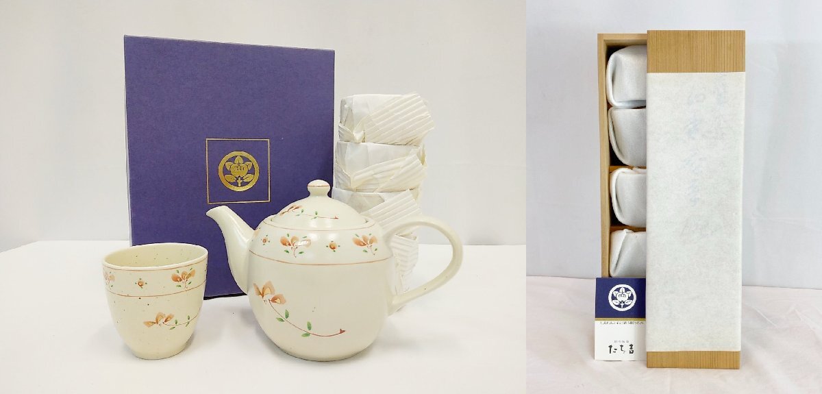 未使用品 たち吉 お茶呑茶碗 花化粧 茶器揃 萌葱金彩 まとめ売り セット 美濃焼 茶器 ティーポット 急須 / 名古屋発5-27
