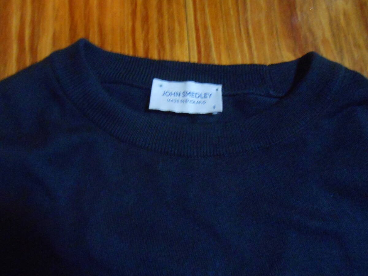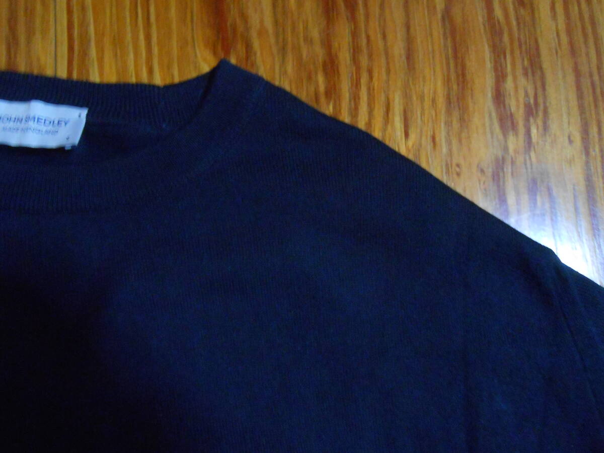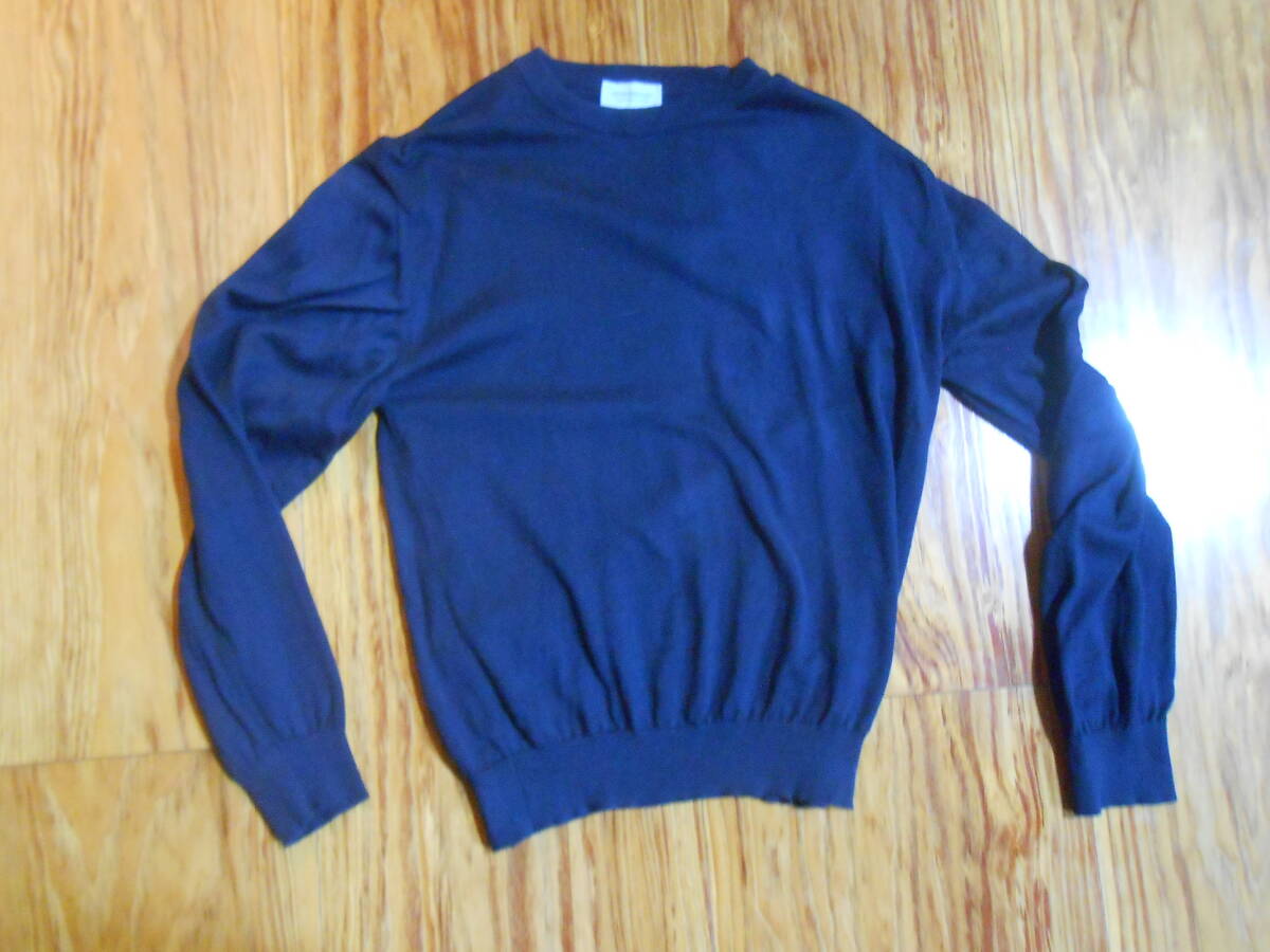 英国 JOHN SMEDLEY ジョンスメドレーの100%シーアイランドコットンの濃紺のクルーネックのハイゲージのセーター。万能の逸品。英国製です。着用感の少なめの美品です。サイズはUK Sで、日本サイズのM位です。実寸で、袖丈:(肩から)58cm、(脇下から)約47cm(=袖先を折り返して調整可能)、肩幅:約47cm、身幅:(脇下~脇下)約49cm、着丈: 約60cmです。ニットなので着用すると多少伸びます。上品な万能のセーターなので、是非この機会に。
