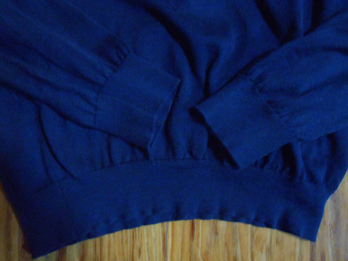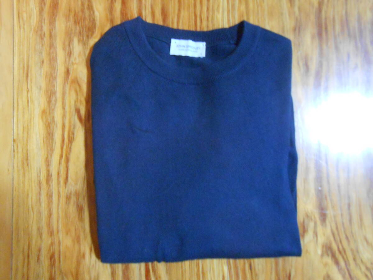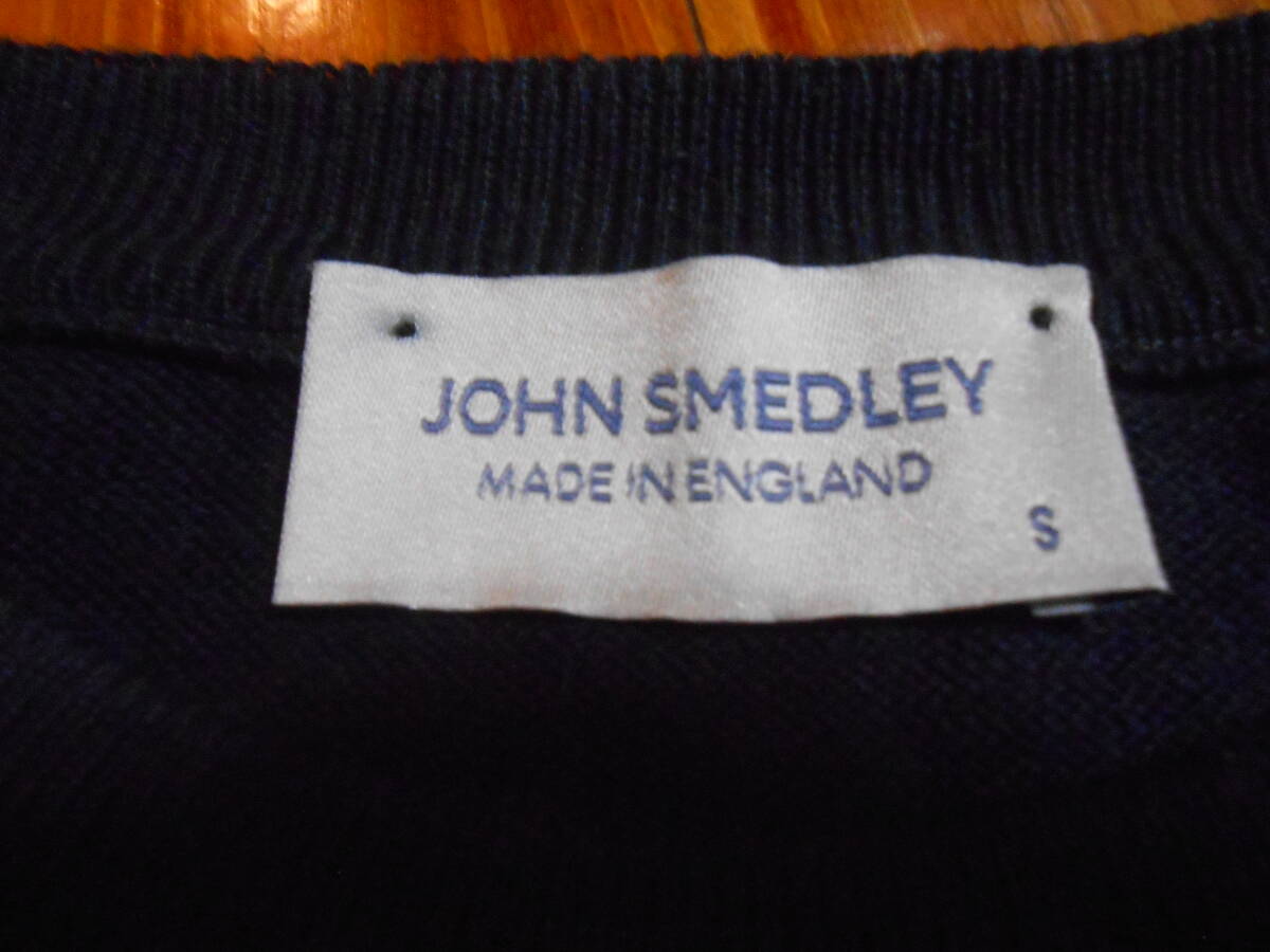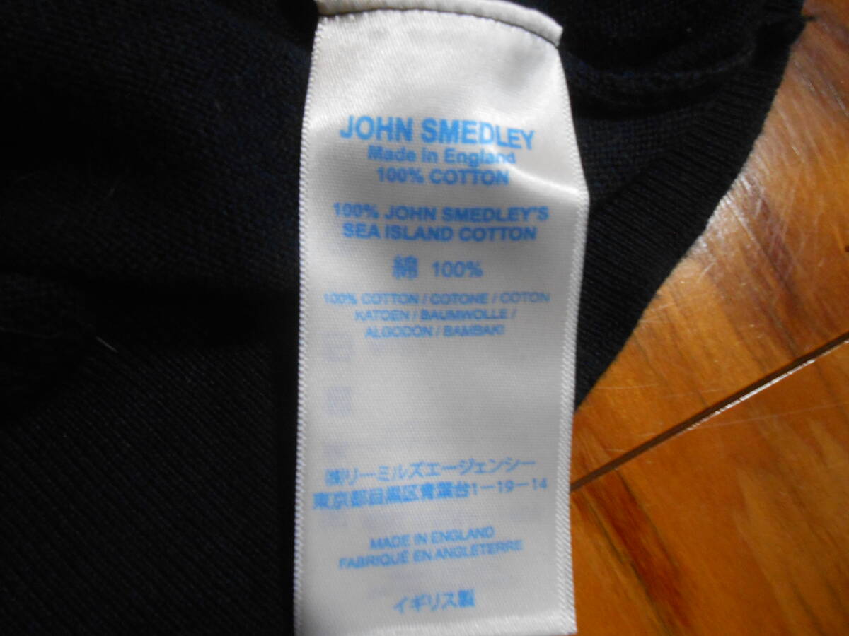 英国 JOHN SMEDLEY ジョンスメドレーの100%シーアイランドコットンの濃紺のクルーネックのハイゲージのセーター。万能の逸品。英国製です。着用感の少なめの美品です。サイズはUK Sで、日本サイズのM位です。実寸で、袖丈:(肩から)58cm、(脇下から)約47cm(=袖先を折り返して調整可能)、肩幅:約47cm、身幅:(脇下~脇下)約49cm、着丈: 約60cmです。ニットなので着用すると多少伸びます。上品な万能のセーターなので、是非この機会に。