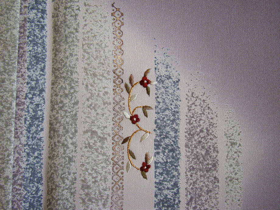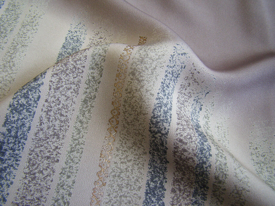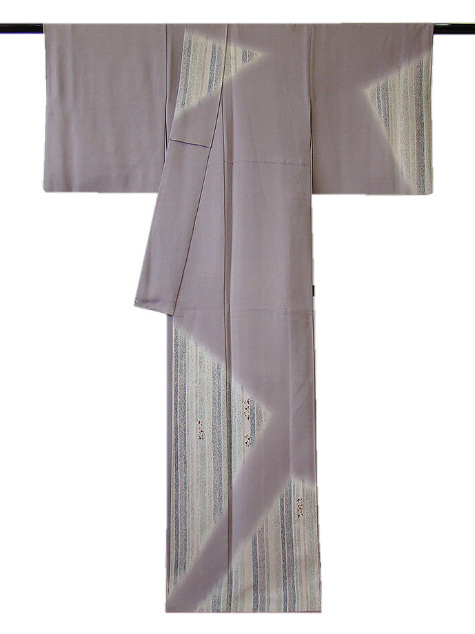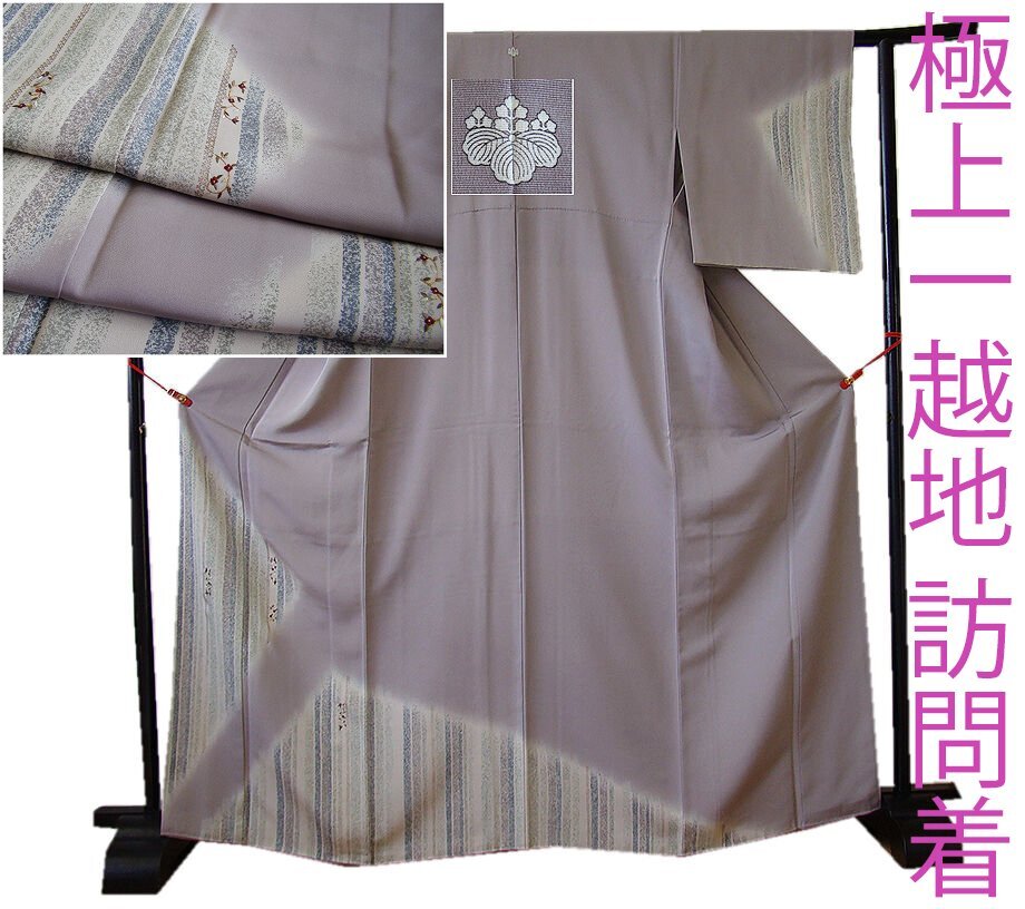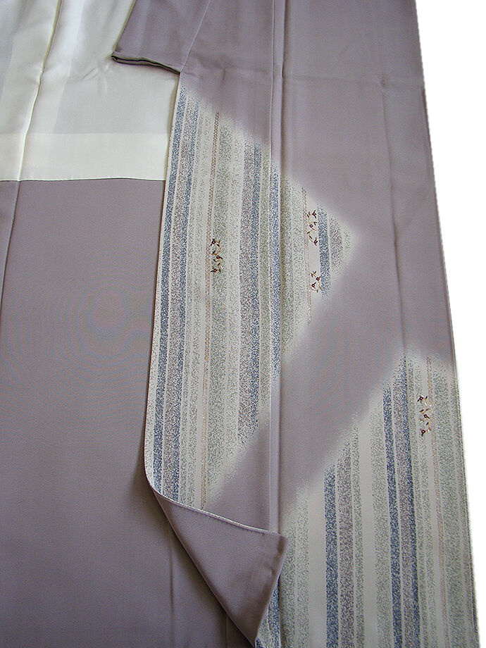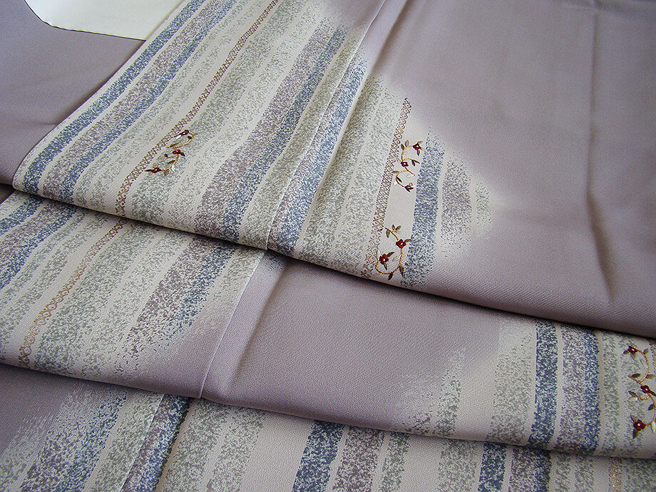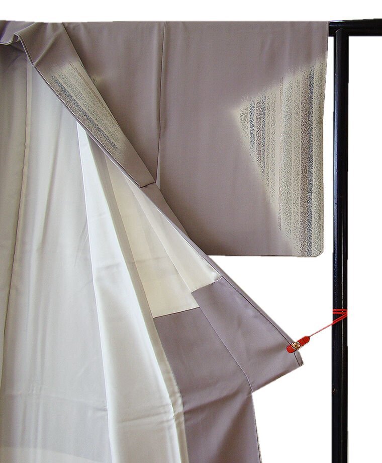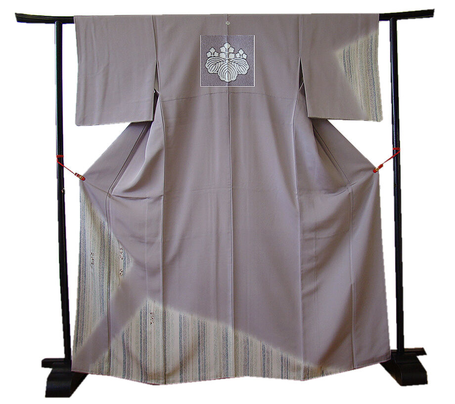 商品説明 | こちらのお品は「袷」ですので10月から5月までお召頂ければと思います。 とてもしなやかで柔らかな滑らかな手触りの着心地良い極上一越地の生地、 源氏鼠色地に絹鼠、藍鼠、青白橡色等の染柄に金銀彩加工に花草柄の刺繍入り、 八掛は共布(正絹)、背に「五三桐」の紋1ヶ、幅広い年代の方にお召し頂けます。 |